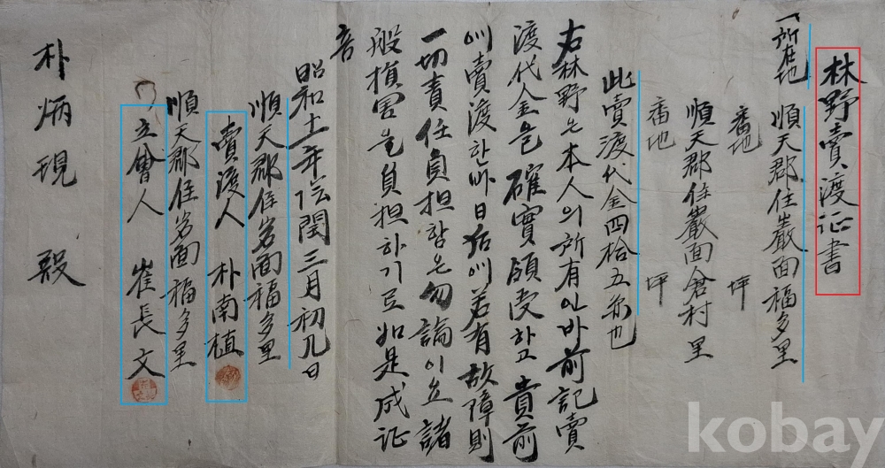 ◈ 소화(昭和) 11년(1936에 임야를 45원에 매도한 증서.