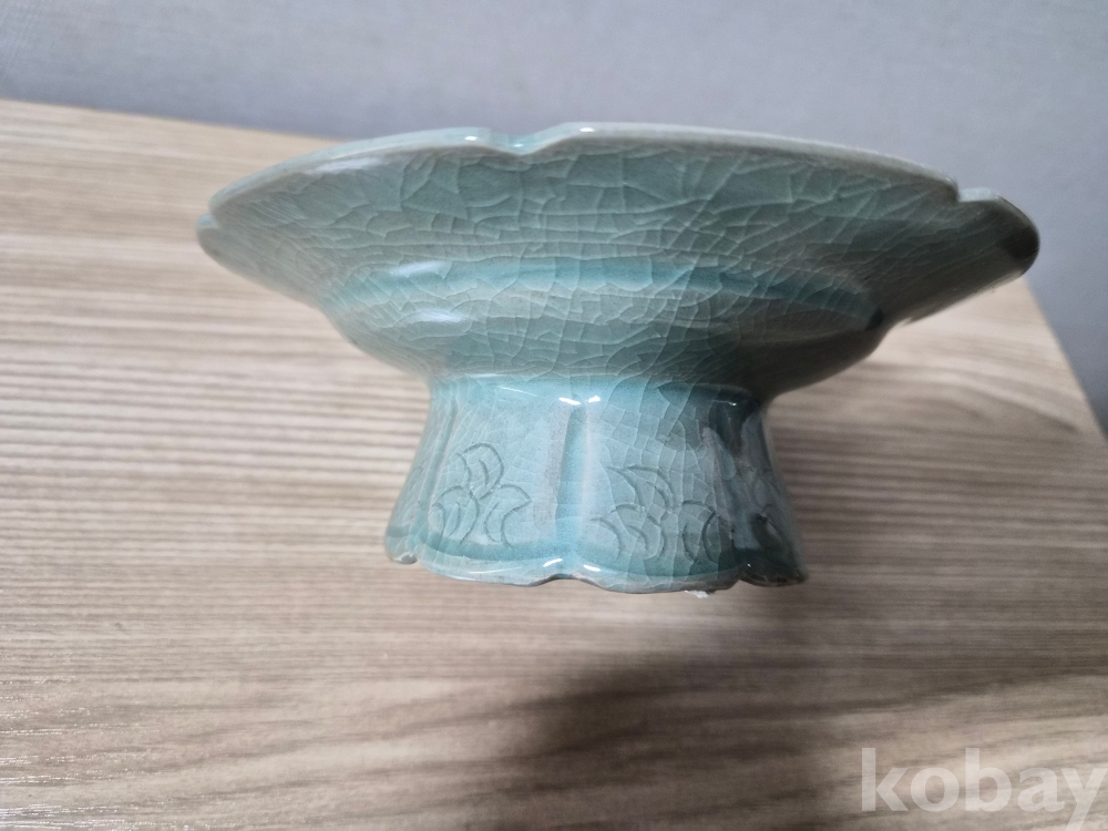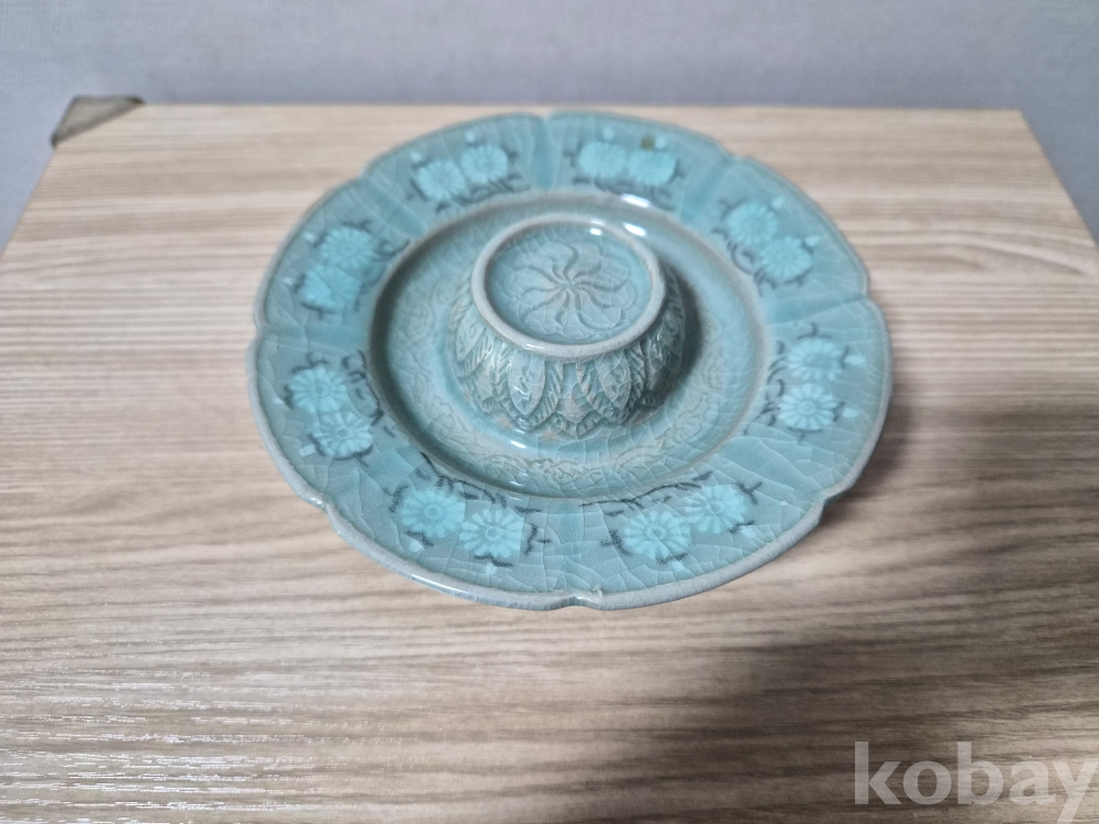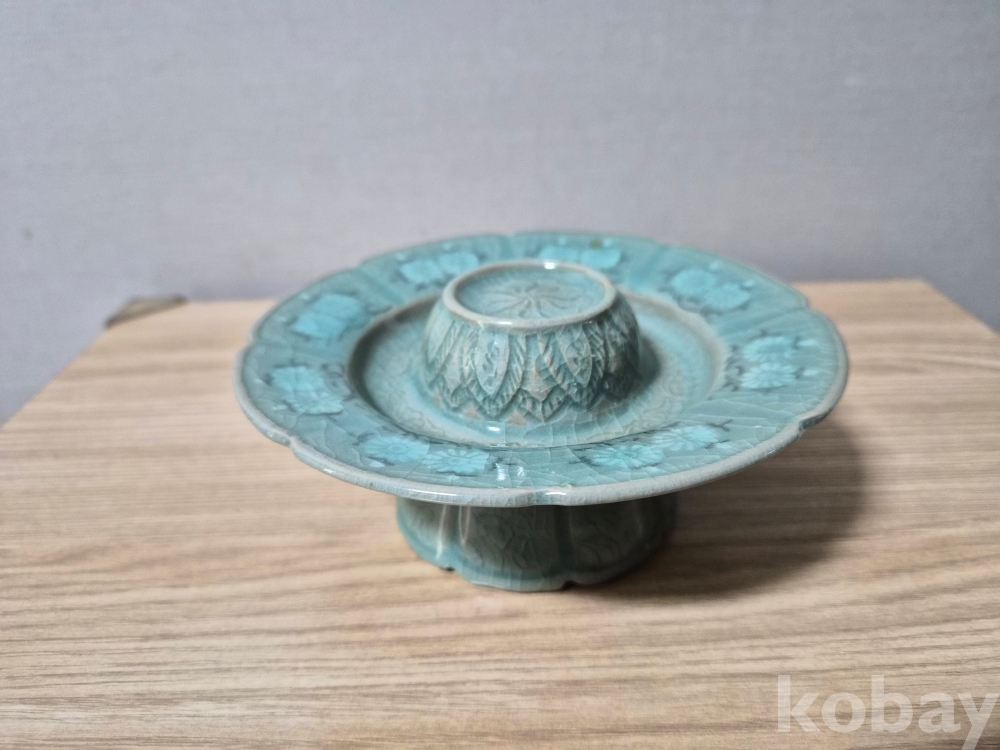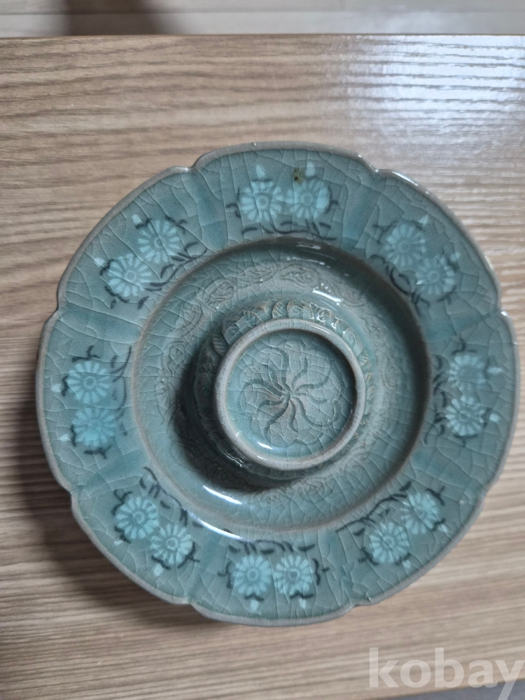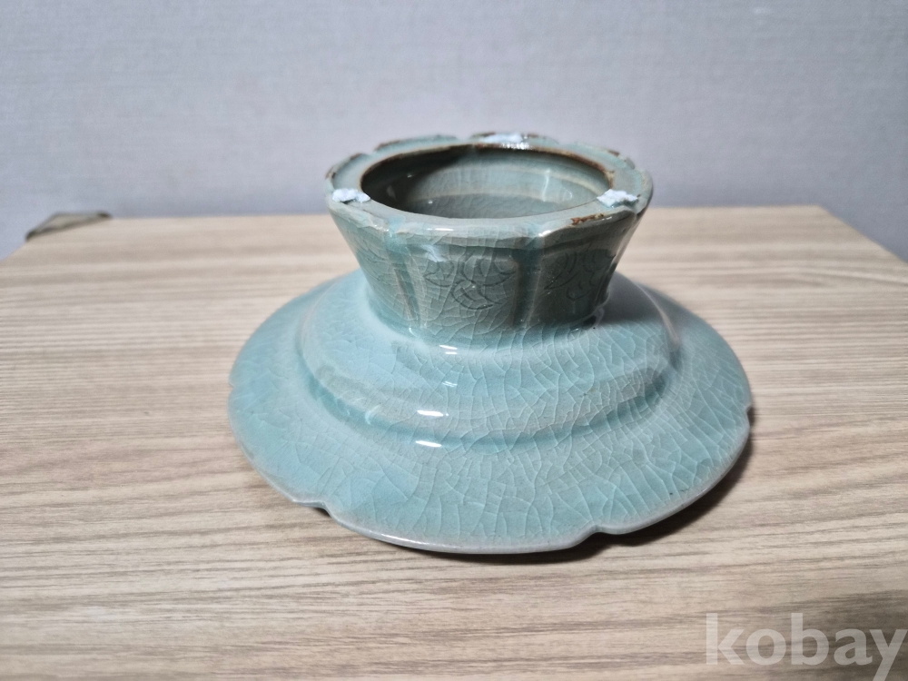 청자흑백상감 잔대입니다.상단에는국화문에 연판문 음각화문이 시문되었고 굽위에도 음각화문이 잘시문되어 있습니다.