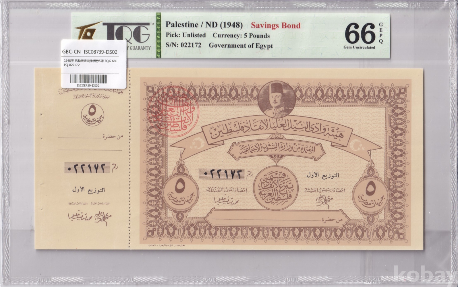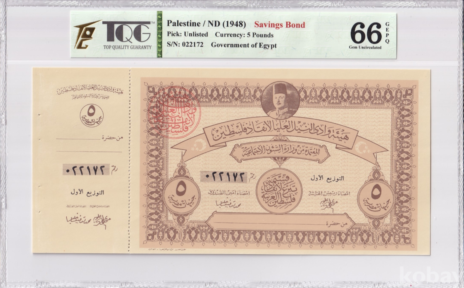 - 이 채권은 1948년 제1차 중동 전쟁(아랍-이스라엘 전쟁) 당시 팔레스타인을 지원하기 위해 이집트 정부에서 발행한 것입니다.