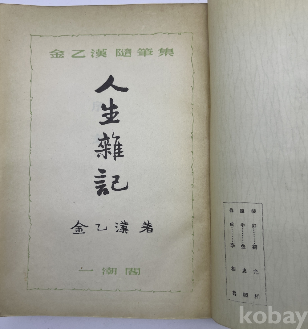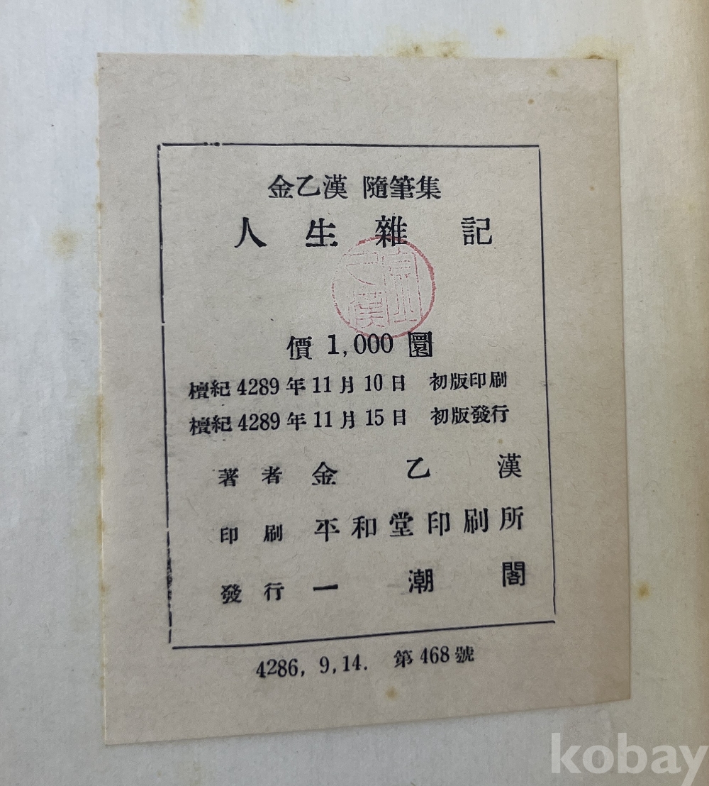 물 품 명 | <신춘문예(新春文藝)> 1956년 일조각(一潮閣) 발행 김을한(金乙漢) 수필집 [인생잡기(人生雜記)] 1책 | |||||