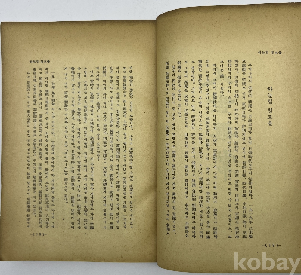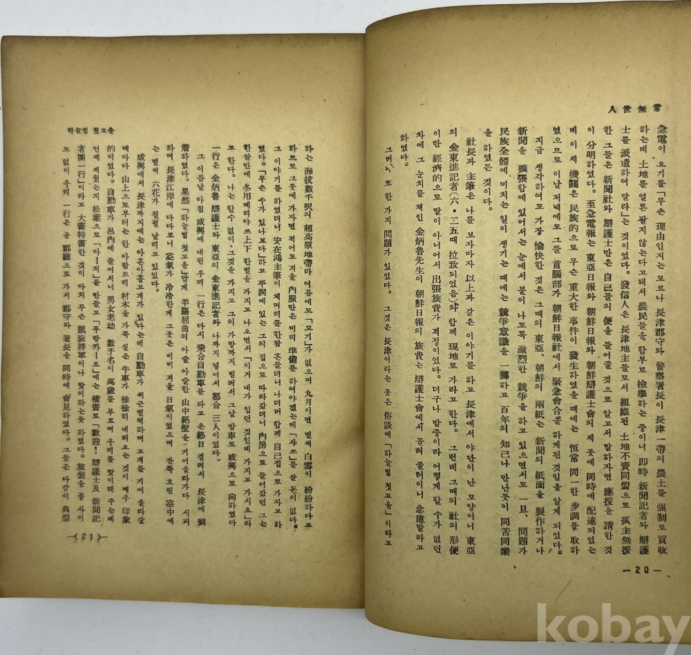 설 명 | 해방 이후 서울신문 동경특파원, 서울신문 이사 등을 역임한 언론인 김을한(金乙漢, 1906~1992)의 수필집이다. 표지 및 책등 훼손이 있으며, 권말과 뒤표지 장정이 불량하다. 이외에 본문 오염 등 있으나 내지 상태는 양호한 편이다. | |||||