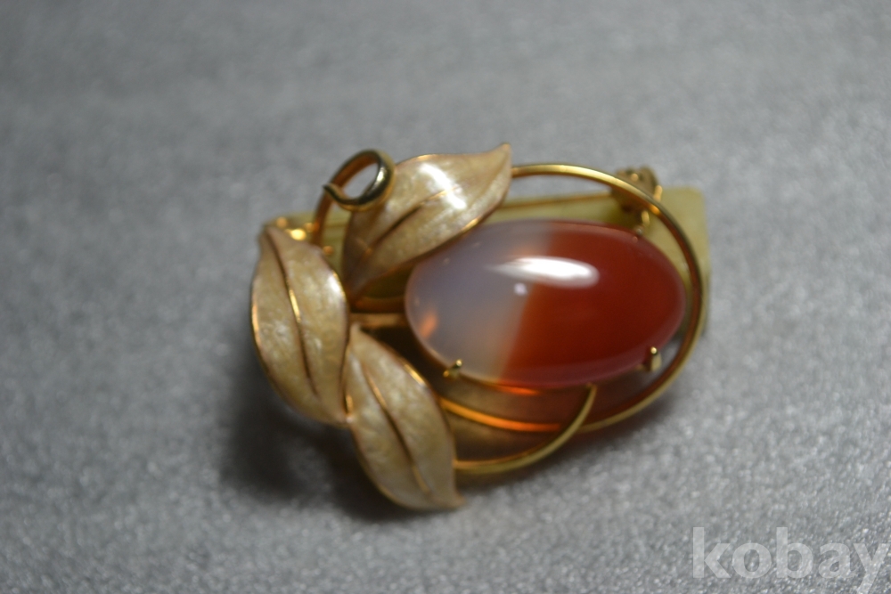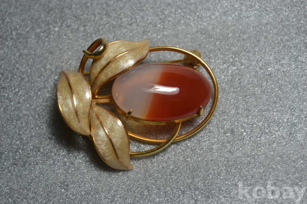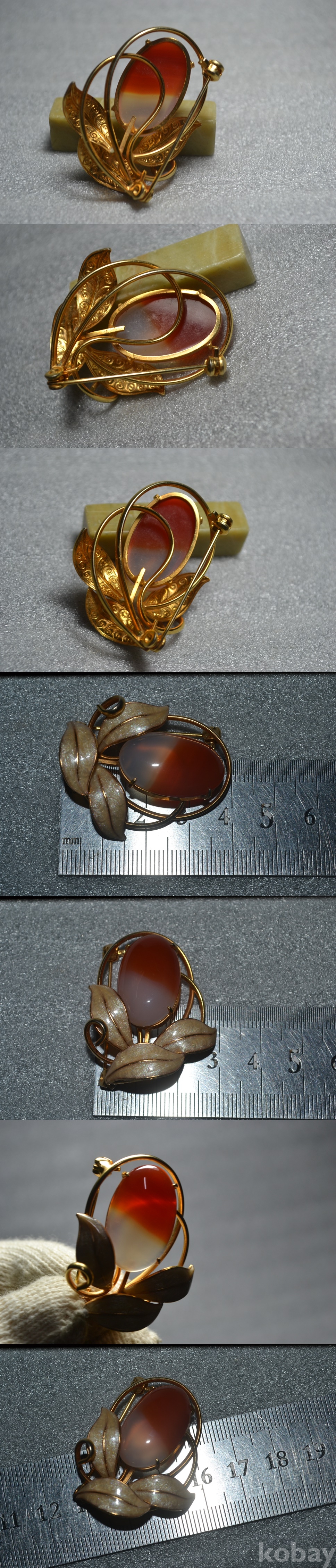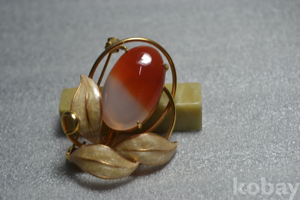 " 진품 적마노보석(고급 칠보장식 잎사귀 디자인) ".. 지름 2.4 cm X 1.5 cm ~ 붉은색상과 흰문양의 고급 적마노알브로치 작품.. 적마노브로치 작품~ 진품 적마노알. 적마노브로치 작품 / 깨끗하고 좋은 보존작품~