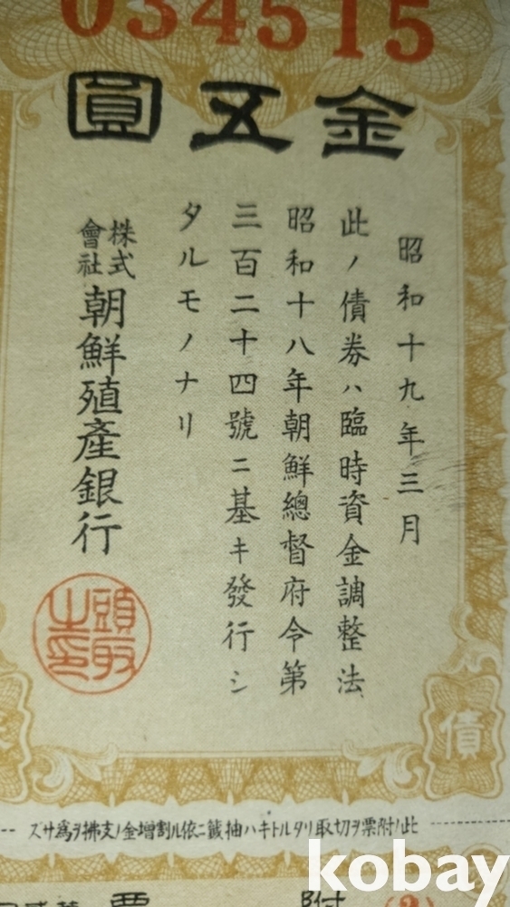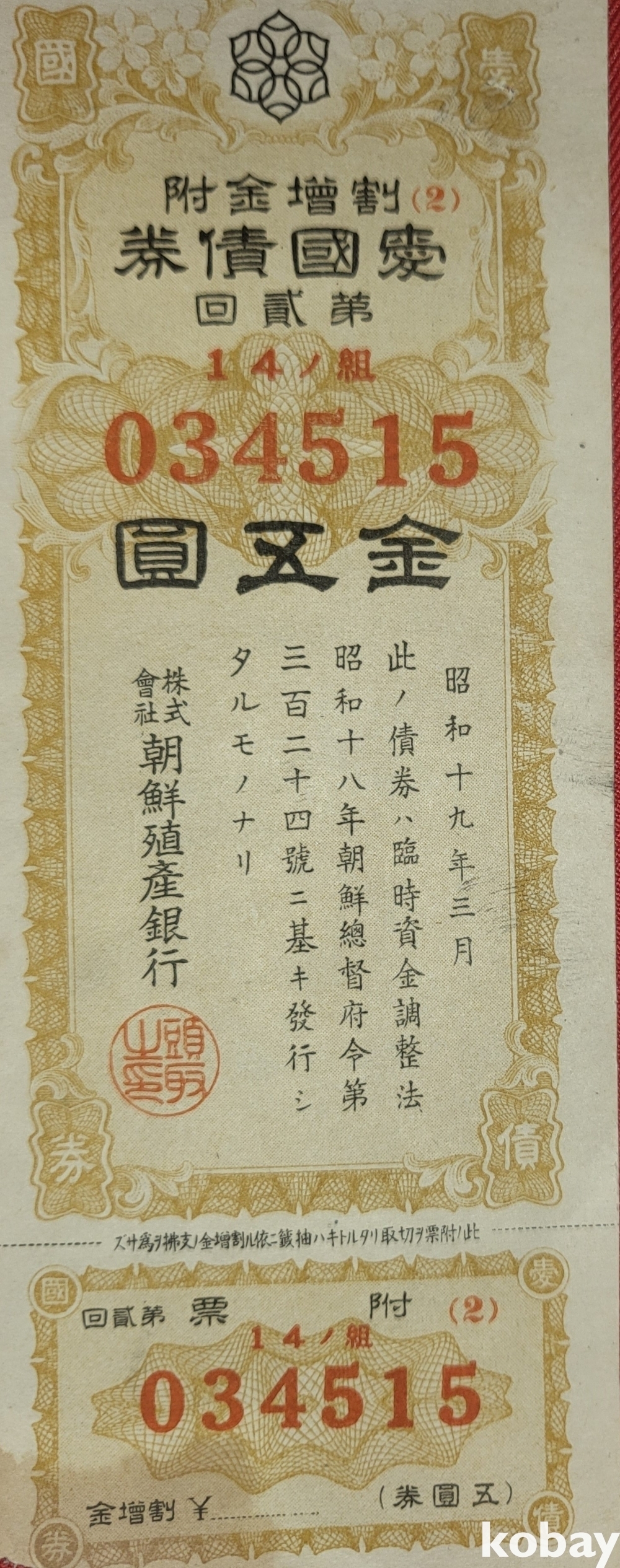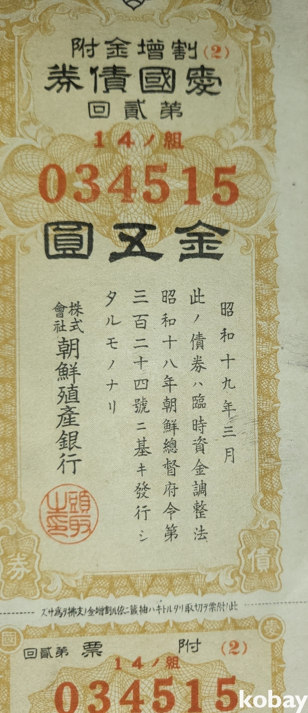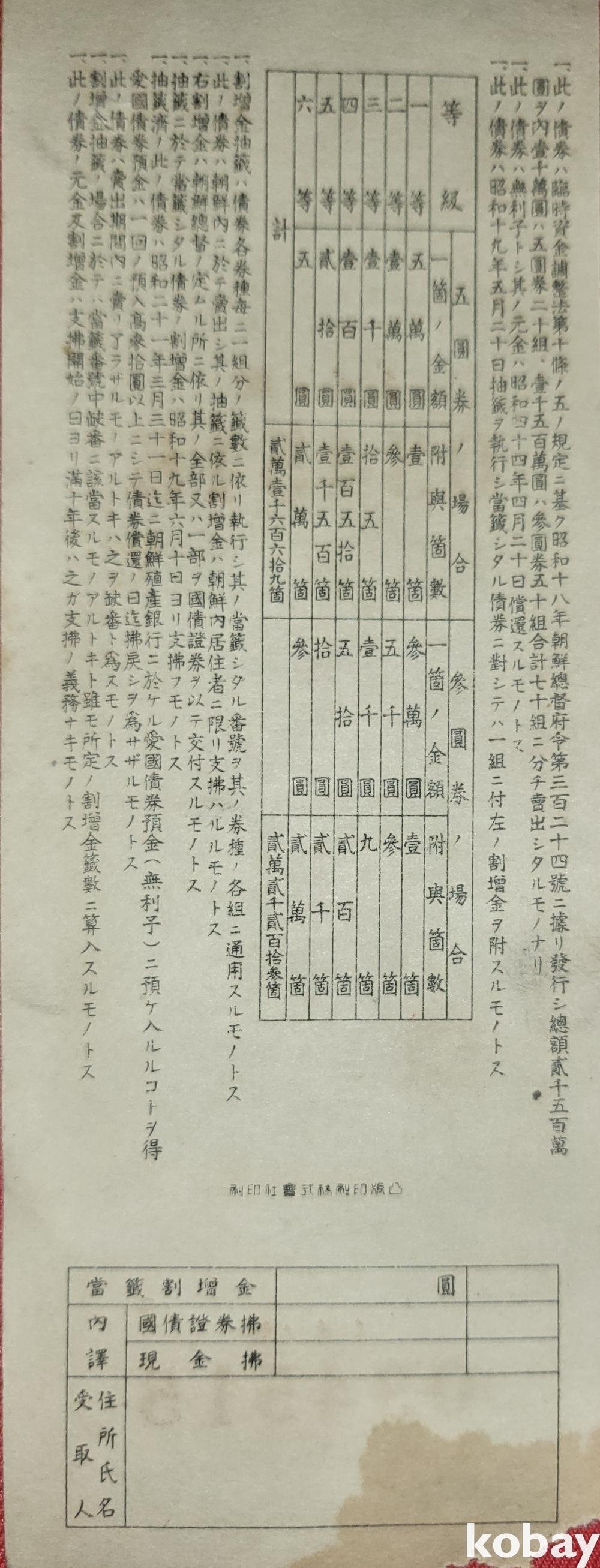 주식회사 조선 직산은행 소하19년(1943년) 발행된 할증금부(割增金附)입니다,