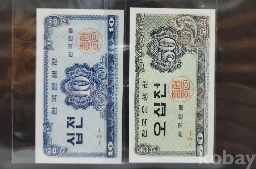 -대한민국 한국은행 소액권전 10전, 50전 2장 미사용 경매합니다.