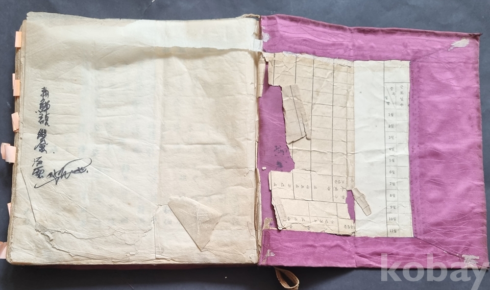 문서 안쪽에 '근로일수', '수당', '월급' 등이 적힌 근대적인 서식지가 붙어 있습니다.