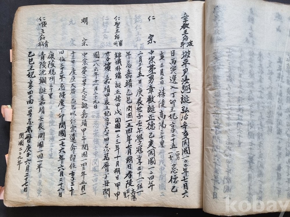 왕실 계보): 태조부터 각 왕과 왕비의 휘(이름), 본관, 탄생일, 즉위일 등이 아주 정갈한 서체로 기록되어 있습니다.