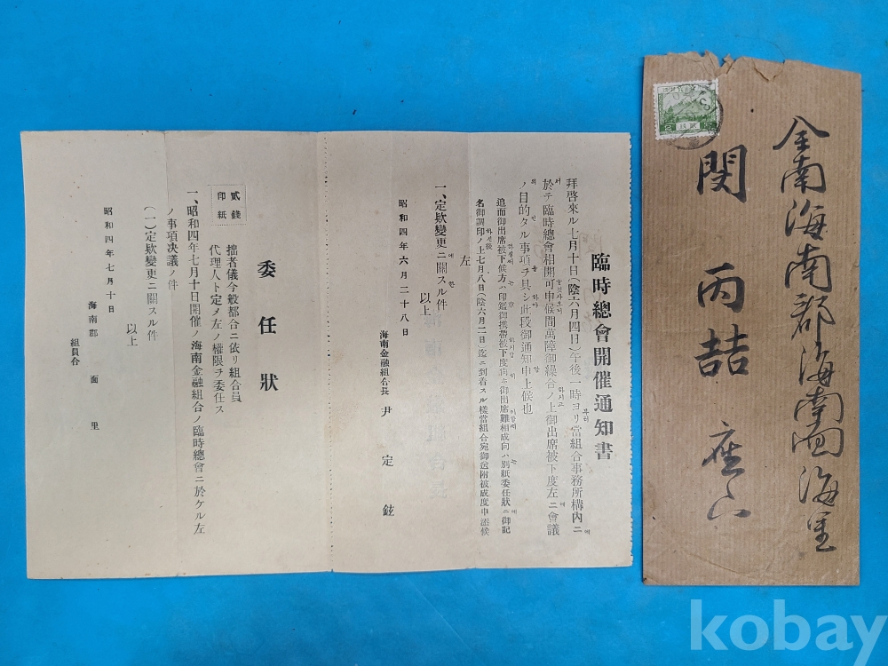 [일제강점기 海南자료] 해남금융조합 임시총회개최통지서,석존대제 헌관 임명장,지불전표, 서찰,실체봉투,유교자료 등