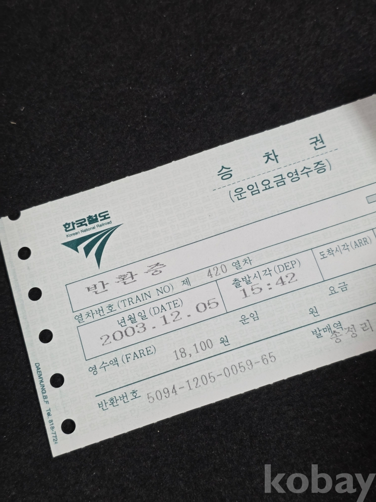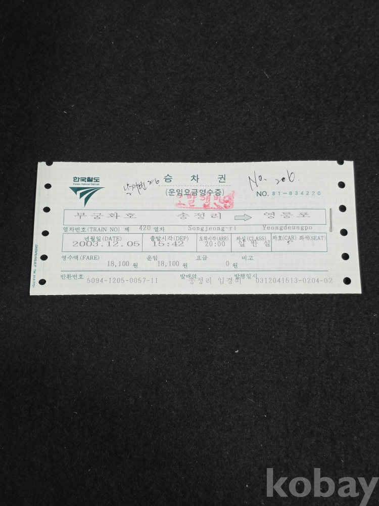(((철도자료/지하철자료))) 2003년 한국철도 승차권 (무궁화호) (송정리-영등포) (오발행반환/반환증) (2매)