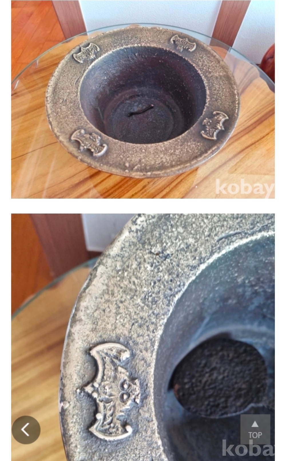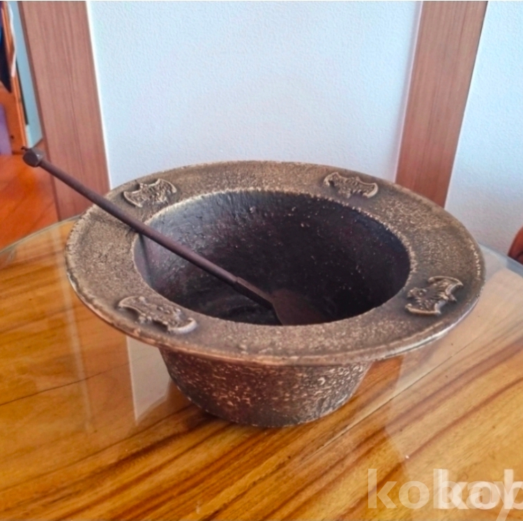 옛날 대가집에서 쓰던 황동 갓화로 ㆍ 독특한 박쥐문양 돋보입니다 상부지름 27 .높이 12.5 .무거운 황동에 부숫가락도 옛날겁니다