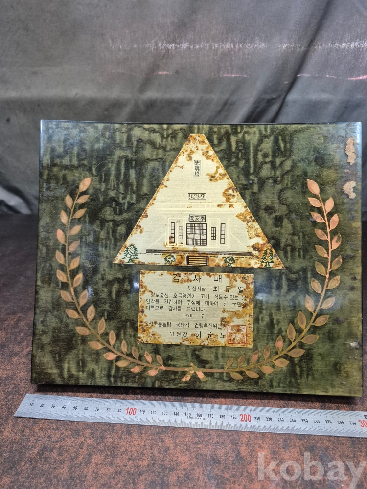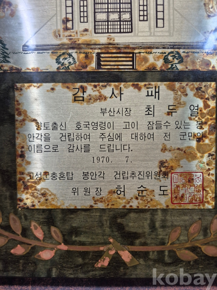 1970년 부산시장 최두열님이 고성군 충혼탑 봉안각 건립추진위원회 위원장에게 드린 감사패 떨어짐 있어요 30*25*3