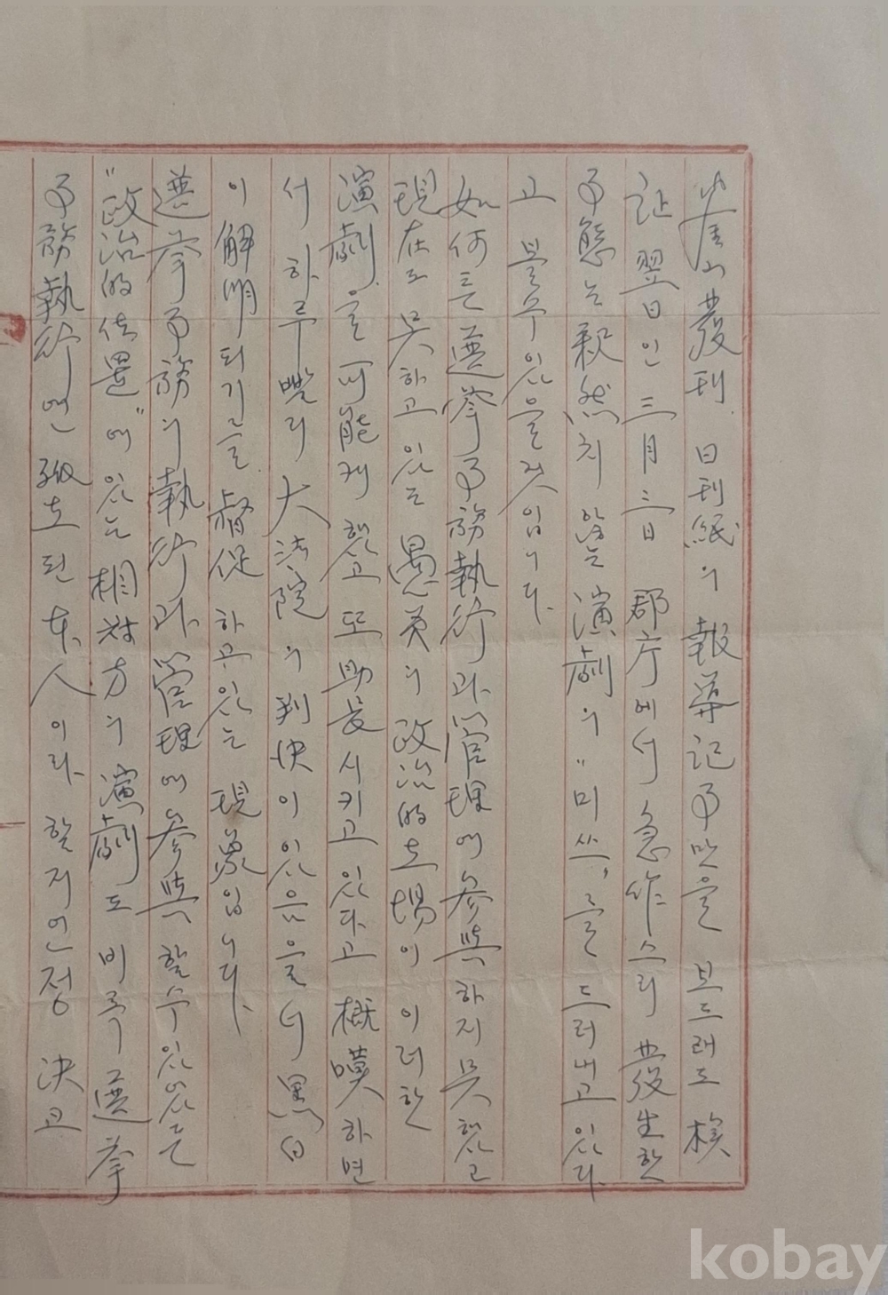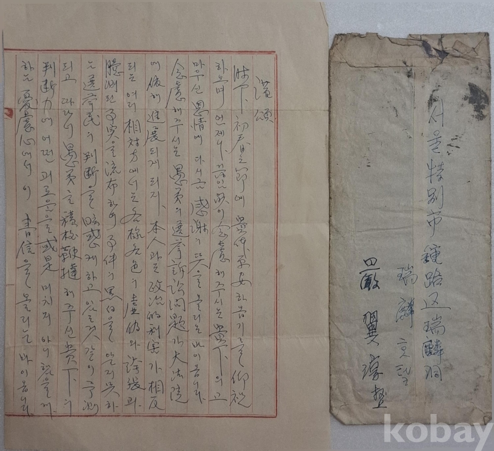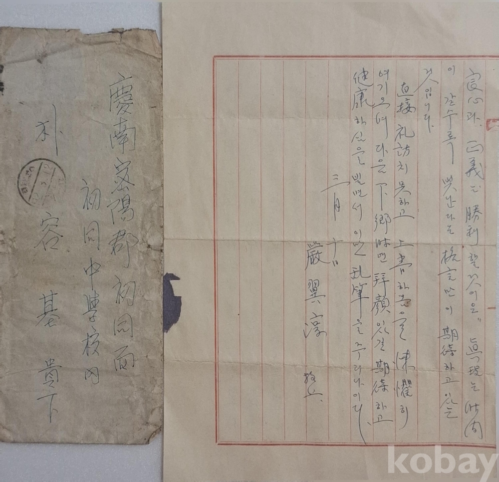 경남 밀양 초동중학교(初同中學校) 내 박용기(朴容基)에게 보낸 국한문혼용 편지.