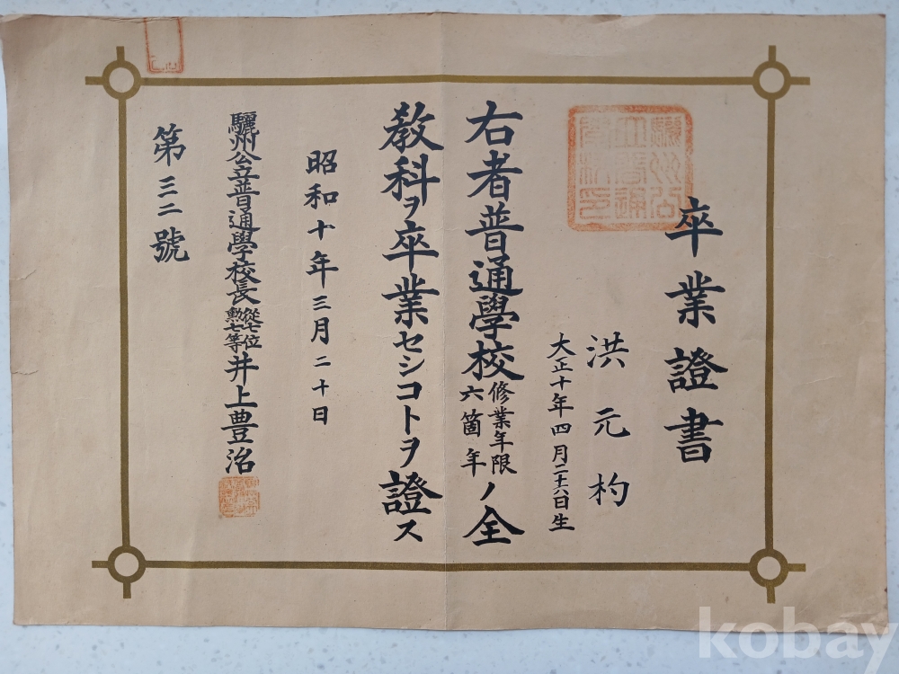 1935년 여주 공립보통학교 졸업장
