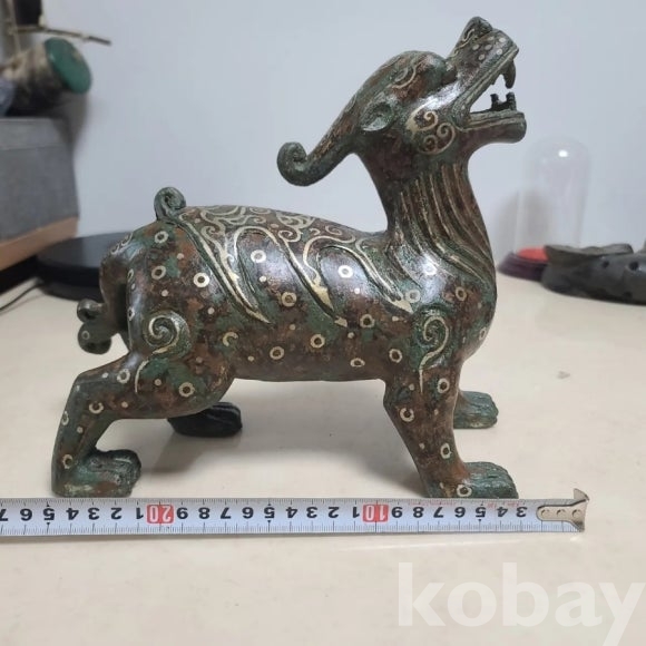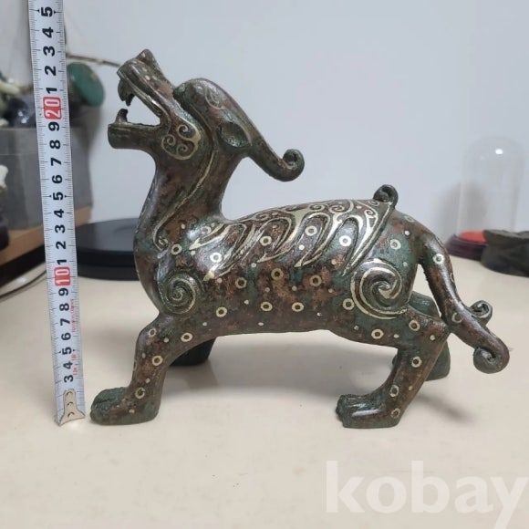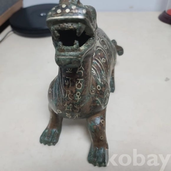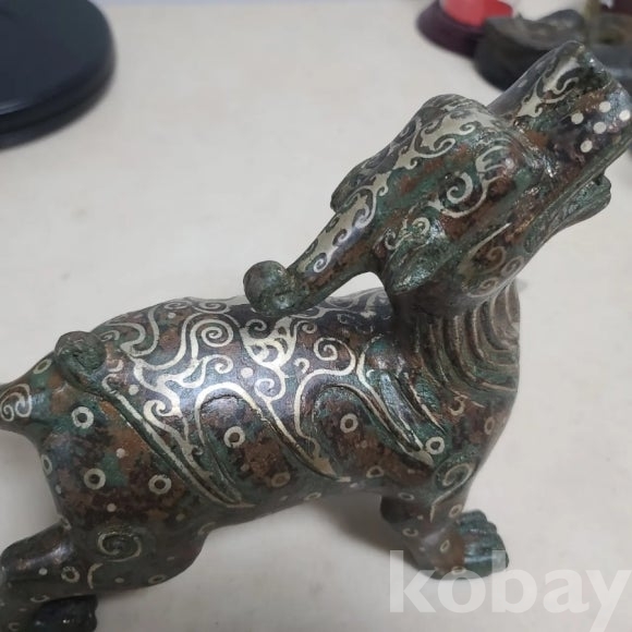청동 은상감입니다. 매우 연식이 있는 골동품이고 그 제작 기법이 매우 독특합니다. 청동의 기물에 은을 입사히여 만든 작품으로 주로 부유한 귀족이나 왕실에서 사용하던 작품을 근대에 와서 재현한 작품으로 추정됩니다 은상감 기법은 주나라 시대에 처음 도입하였으나 작업 과정이 매우 복잡하고 일반에게도 잘 공개되지 않은 기법으로 숙련된 공인에게서 나오는 작품입니다