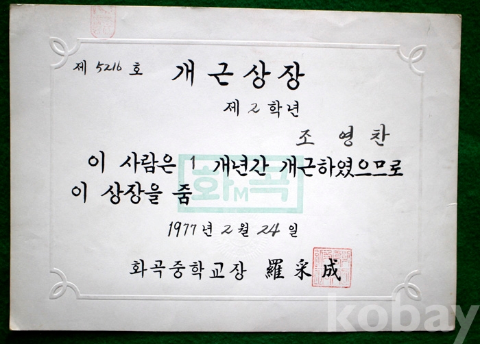 (상장 및 졸업장) 1977년 화곡중학교의 개근상장 ...
