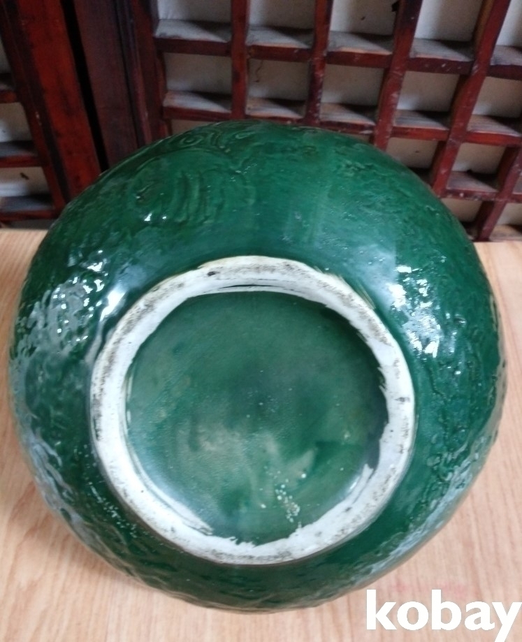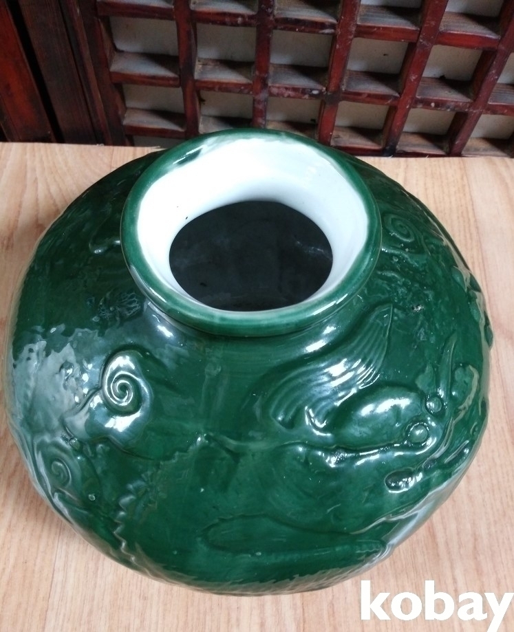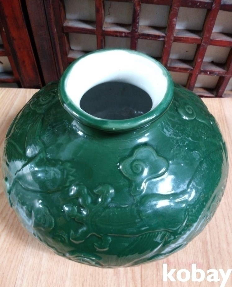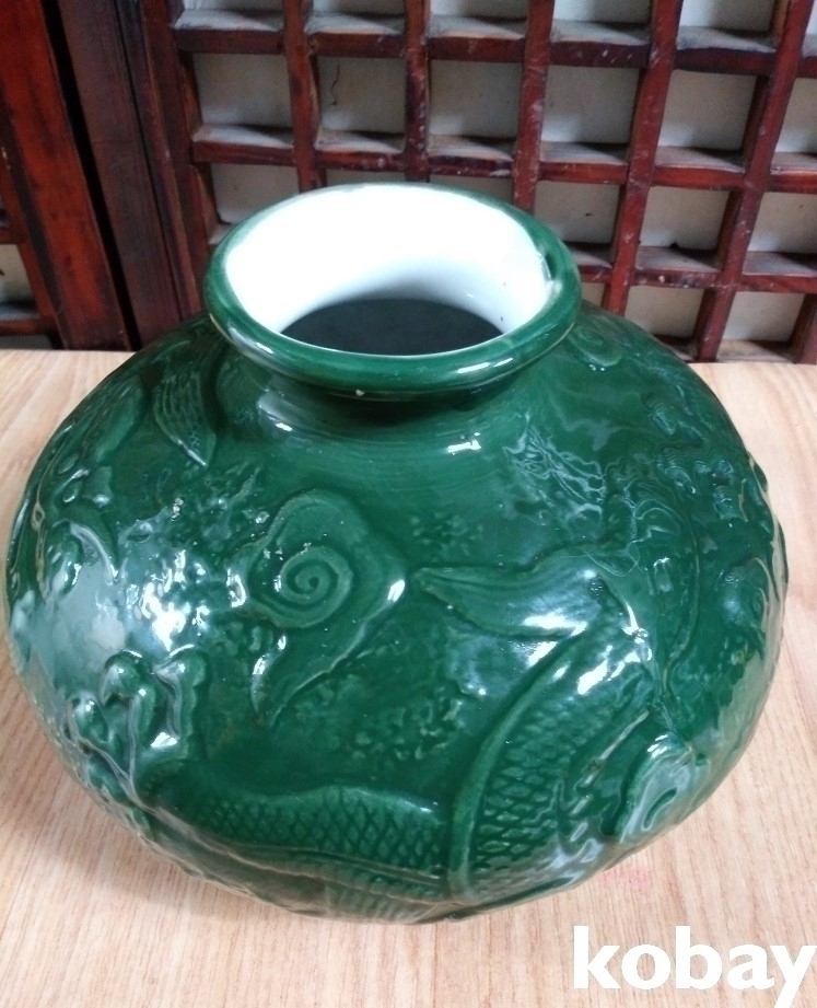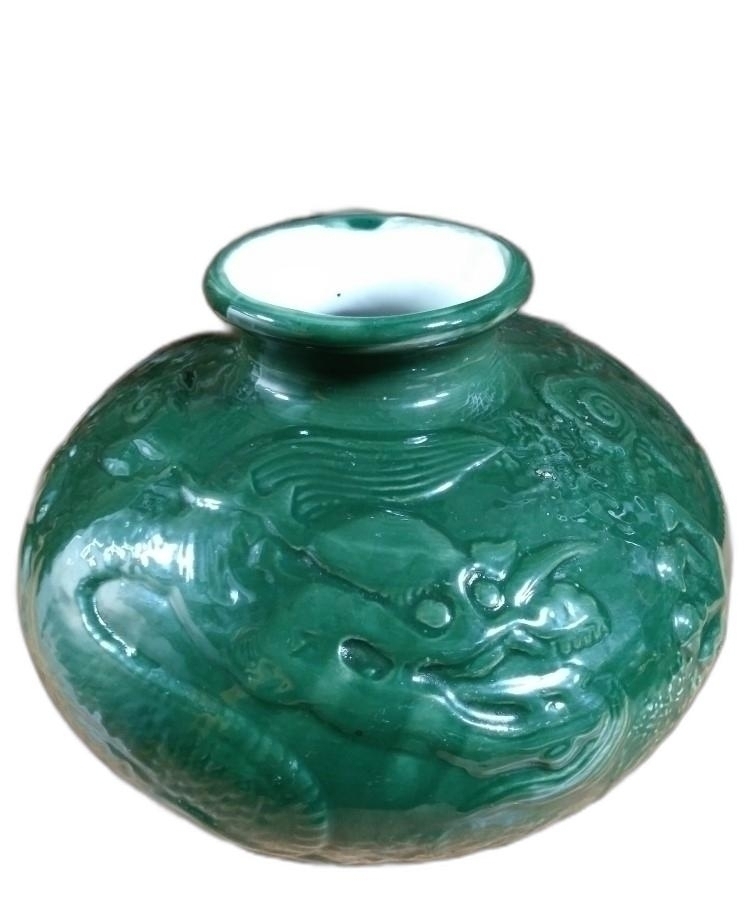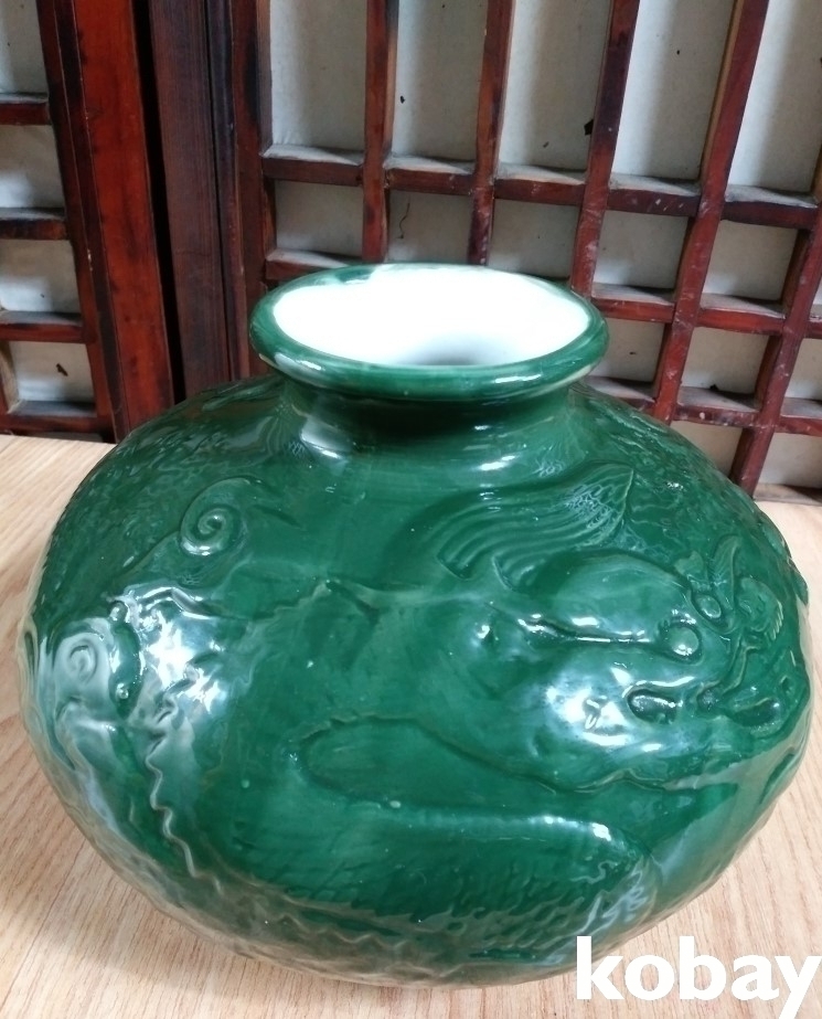 용 문양이 돌출로 되어 있는 초록 도자기 입니다.