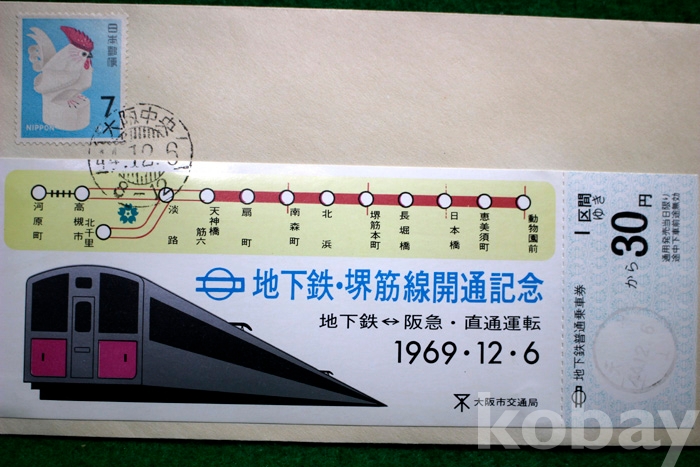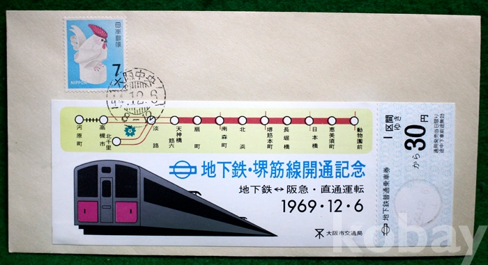 (초일봉피) 1969년 일본의 지하철 堺筋(사카이스지)노선 개통기념 보통승차권이 첨부된 초일봉피 ...