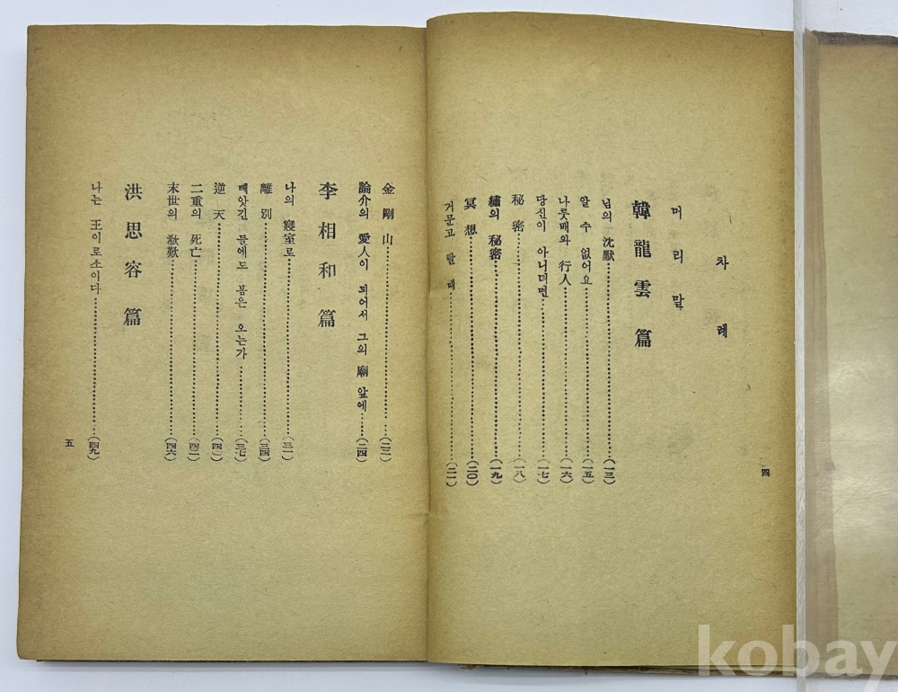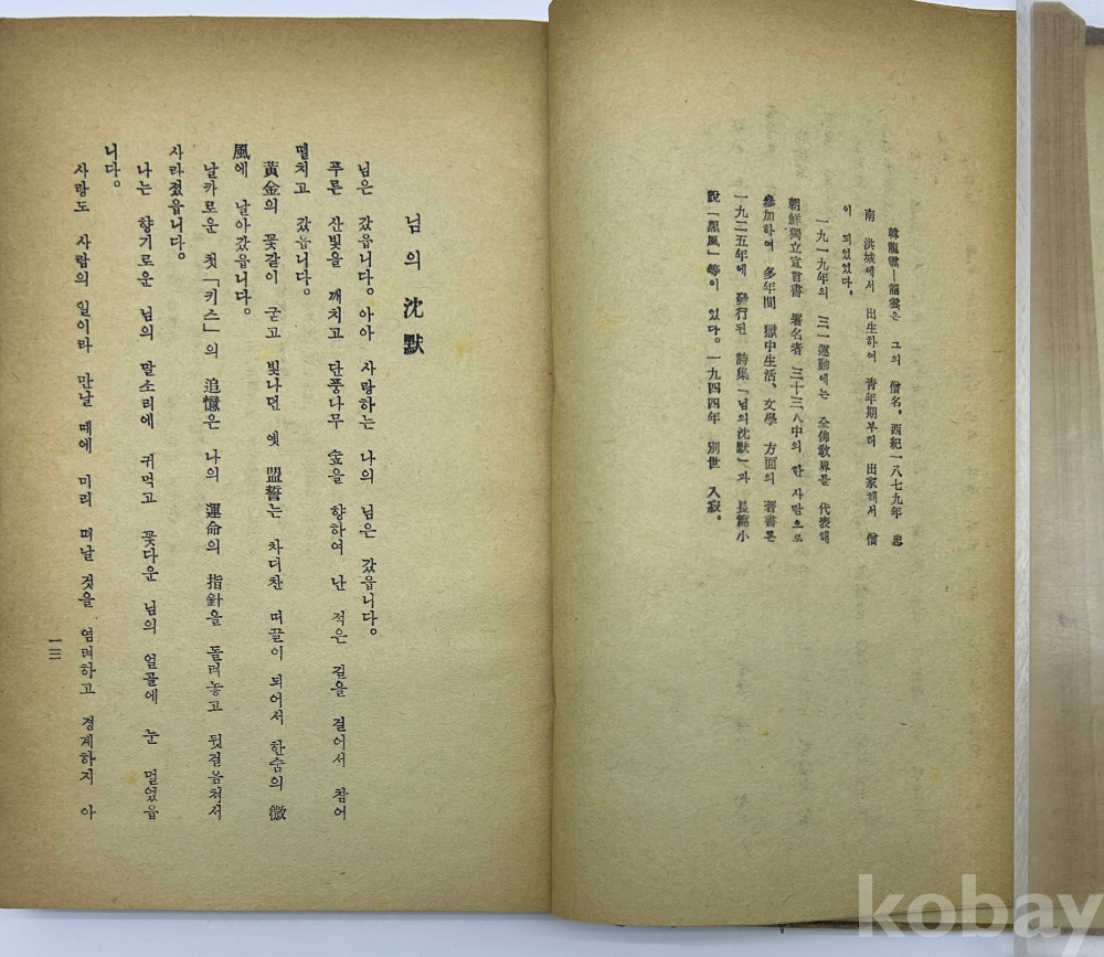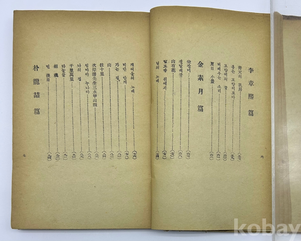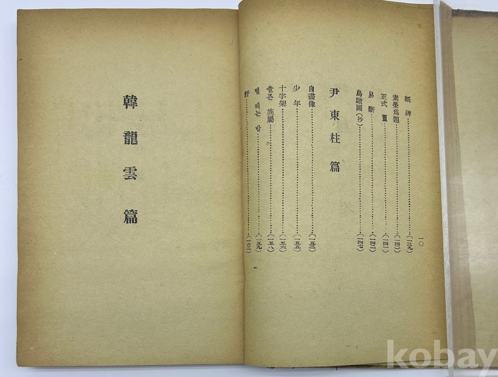 설 명 | 1950년 정음사 발행, 서정주 編 [작고시인선] 1책이다. 한용운, 이상화, 김소월, 윤동주, 이상 등 10인의 시가 수록되어 있다. 판권지는 본래 없는 것으로 보이며, 표지와 내표지에서 발행처와 연도를 확인 할 수 있다. | |||||