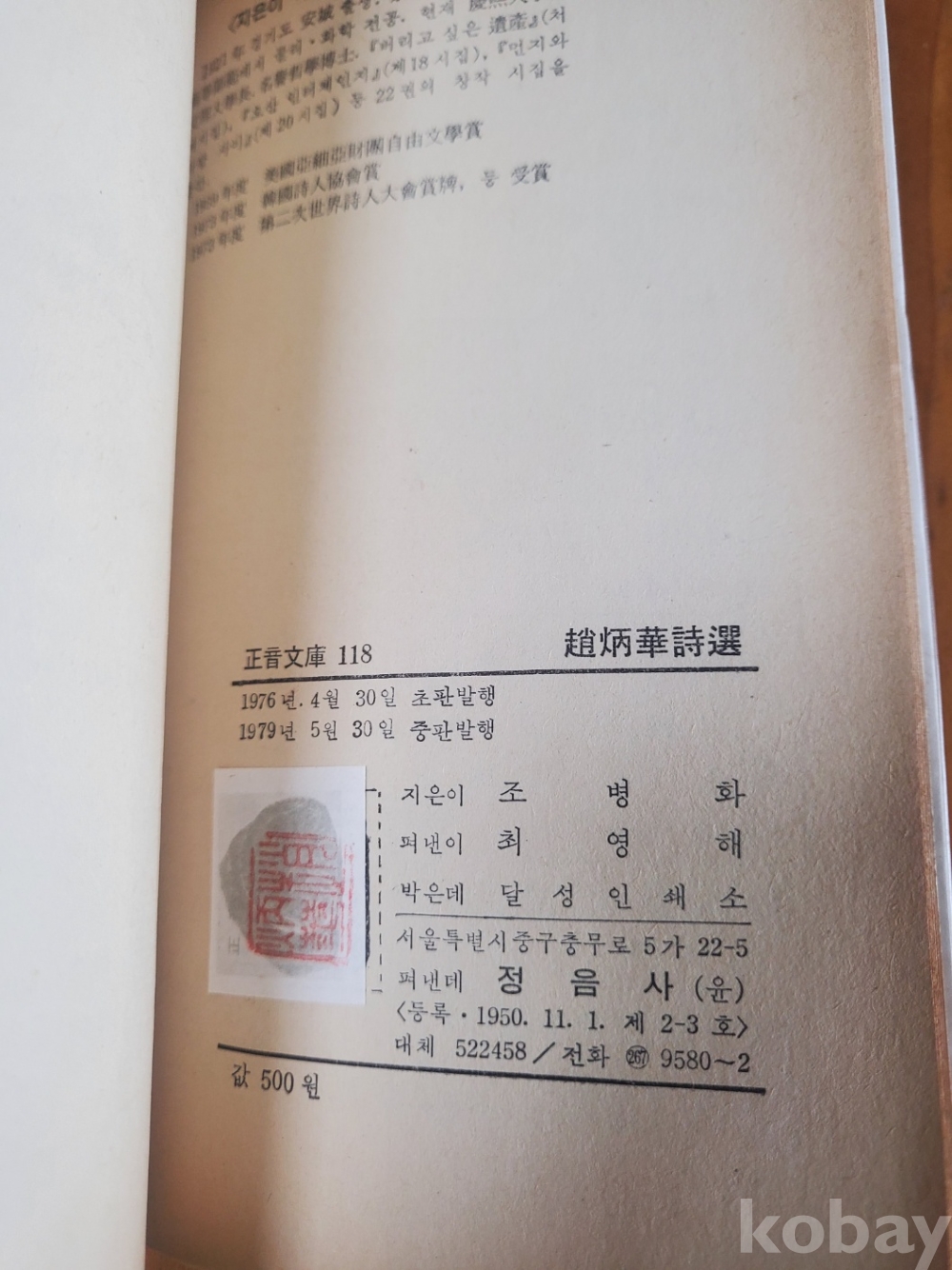 1. 조병화시선, 조병화, 정음사, 1979년, 245쪽, 상태 상, 사진 참조