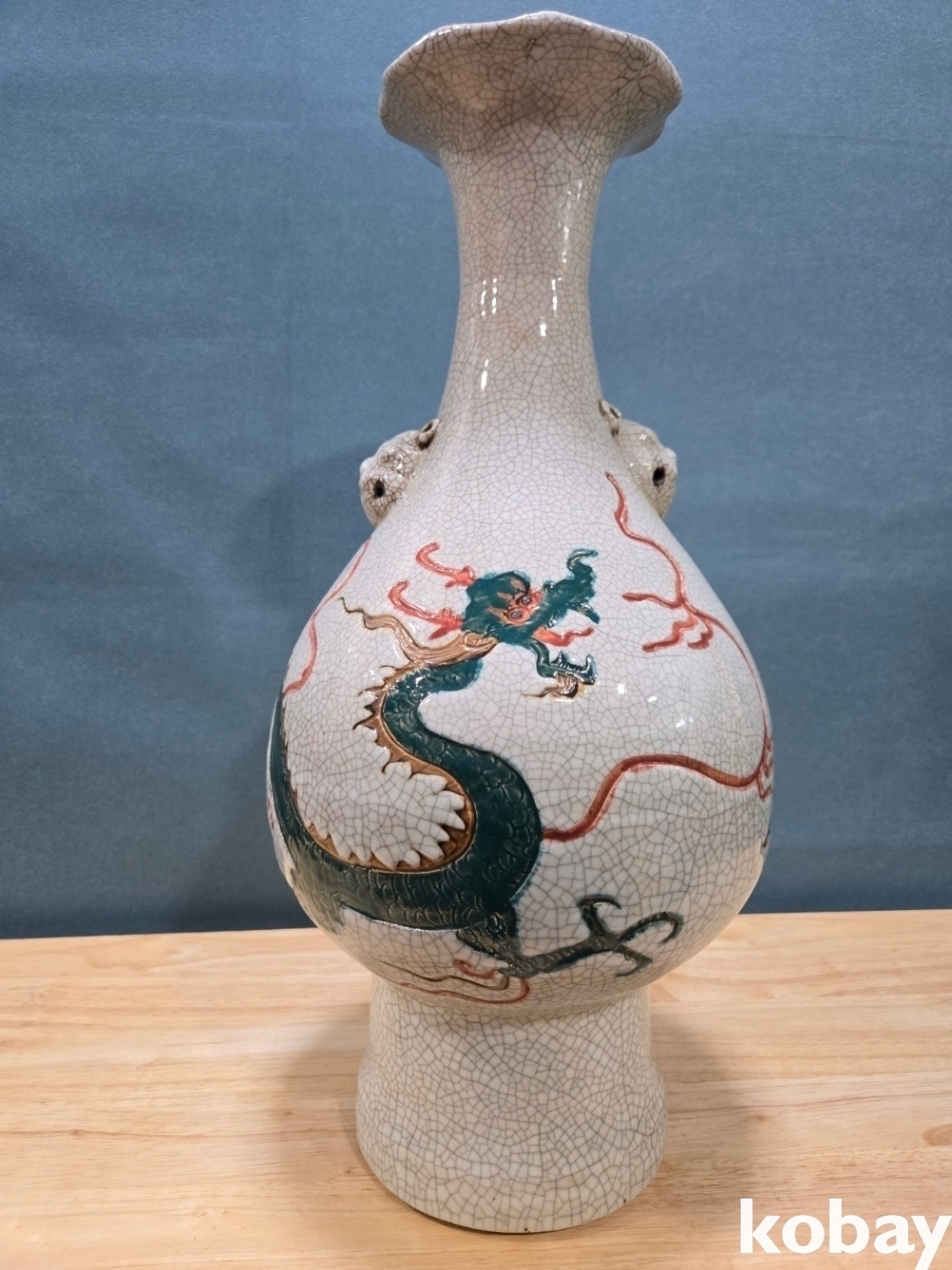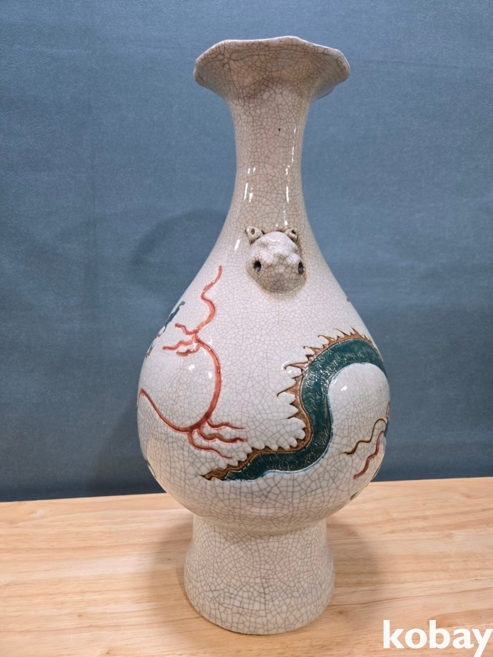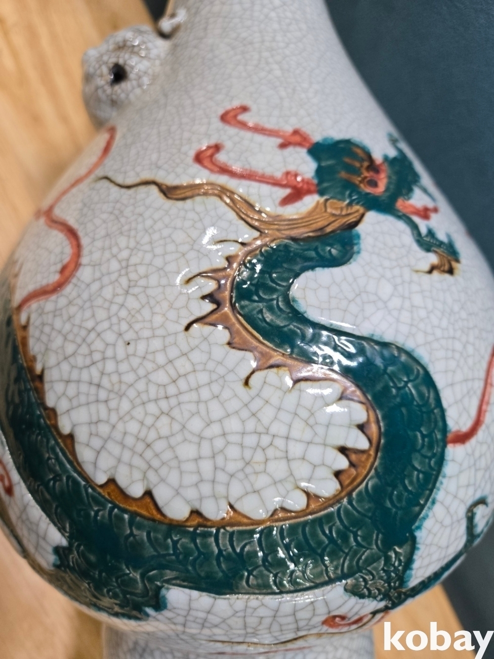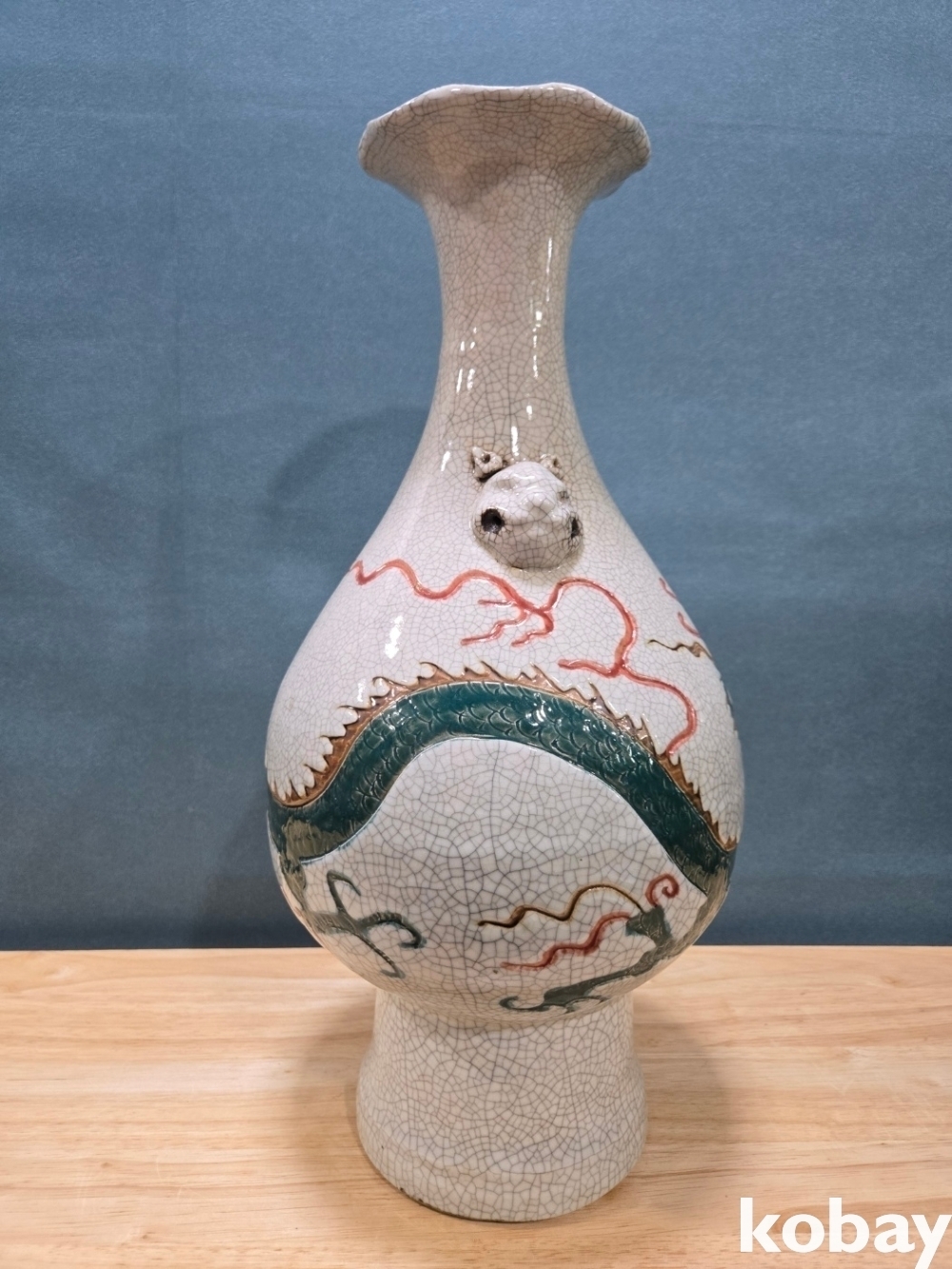 초록 용이 몸통을 휘감겨 있는 화형 양이 도자기 입니다.