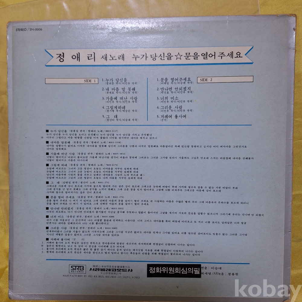 정애리 새노래 (누가 당신을/문을 열어주세요). LP