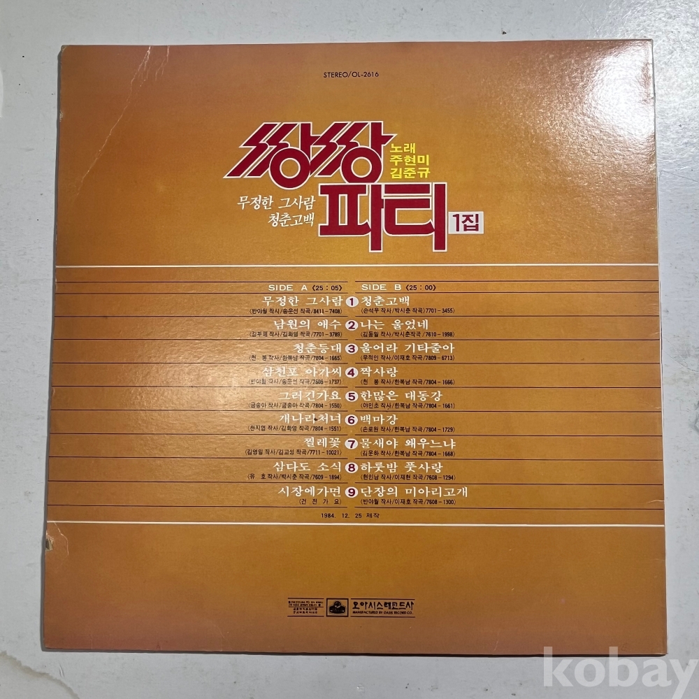 | 자켓상태 | EX : 약간의 마모, 모서리 찢김 존재 | 음반상태 | VG : 생활 기스 다수, 가벼운 노이즈 존재 | 발매정보 | 알수없음 | 가사지여부 | 무 |