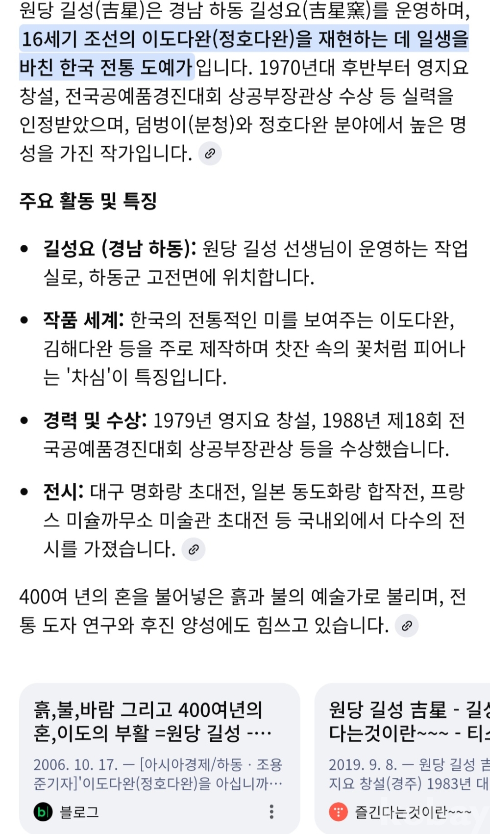 "원당 길성(吉星)은 경남 하동 길성요(吉星窯)를 운영하며, 16세기 조선의 이도다완(정호다완)을 재현하는 데 일생을 바친 한국 전통 도예가입니다. 1970년대 후반부터 영지요 창설, 전국공예품경진대회 상공부장관상 수상 등 실력을 인정받았으며, 덤벙이(분청)와 정호다완 분야에서 높은 명성을 가진 작가입니다.