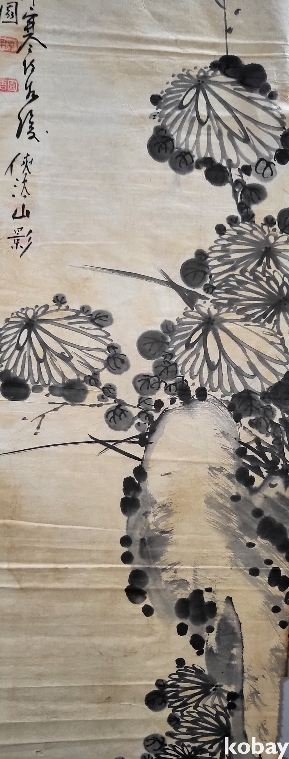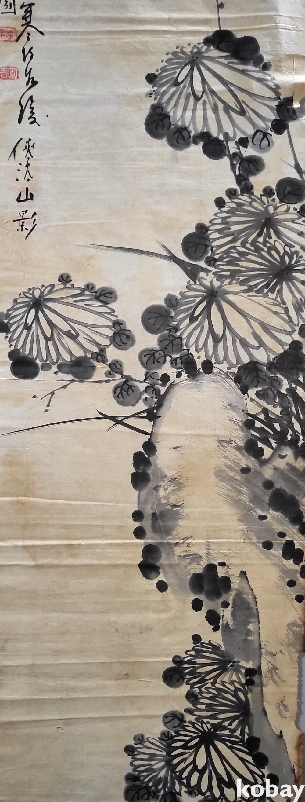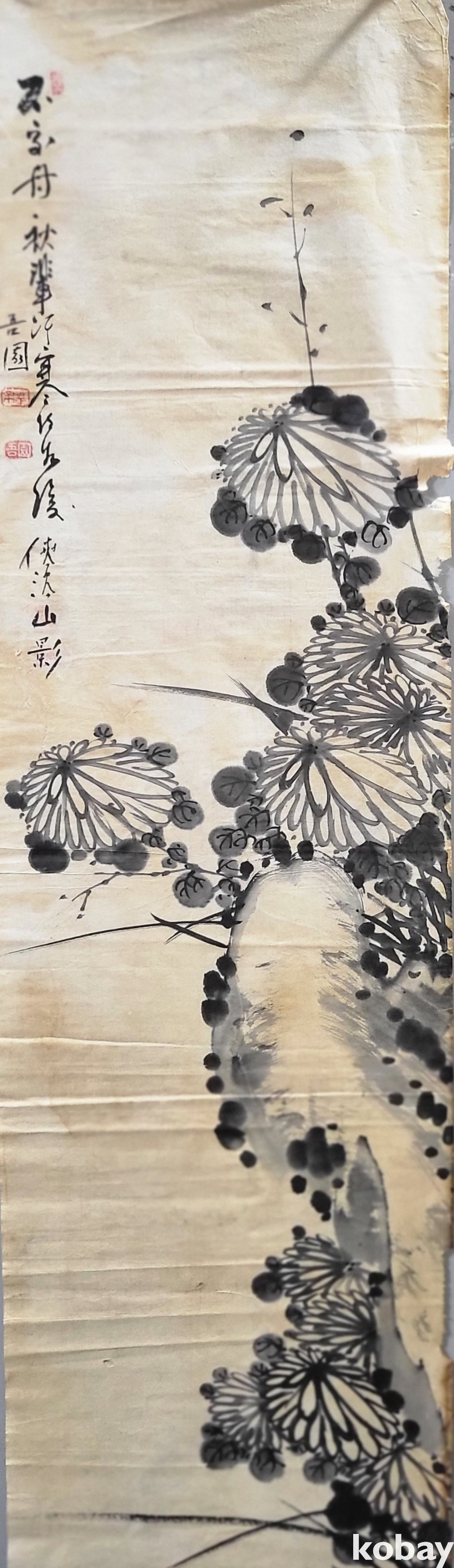吾園 承業(오원 승업) 수결이 보이는 종이에 수묵(水墨) 으로 채색된 괴석에 국화그림입니다,