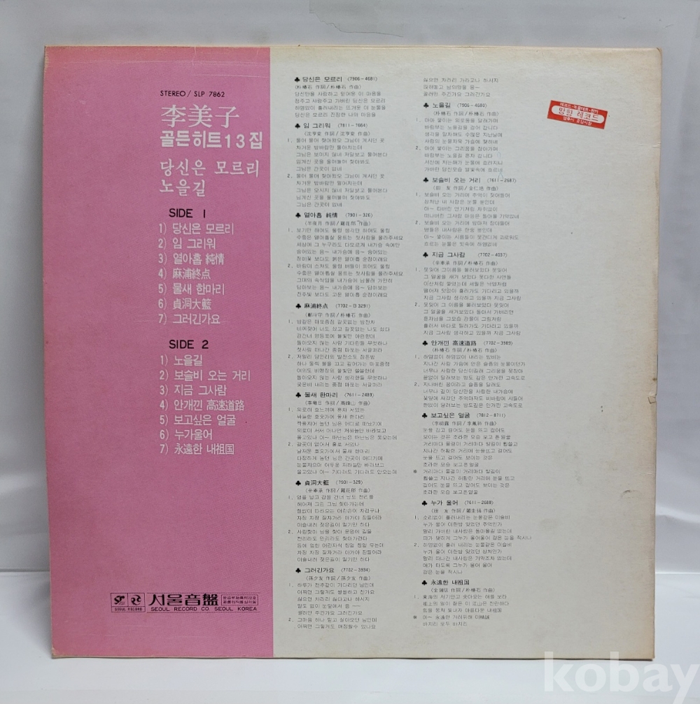 | 자켓상태 | VG : 주름, 접힘, 모서리 찢김 다수 | 음반상태 | EX : 재생에 영향 없는 가벼운 기스 존재 | 발매정보 | 초반 | 가사지여부 | 무 |