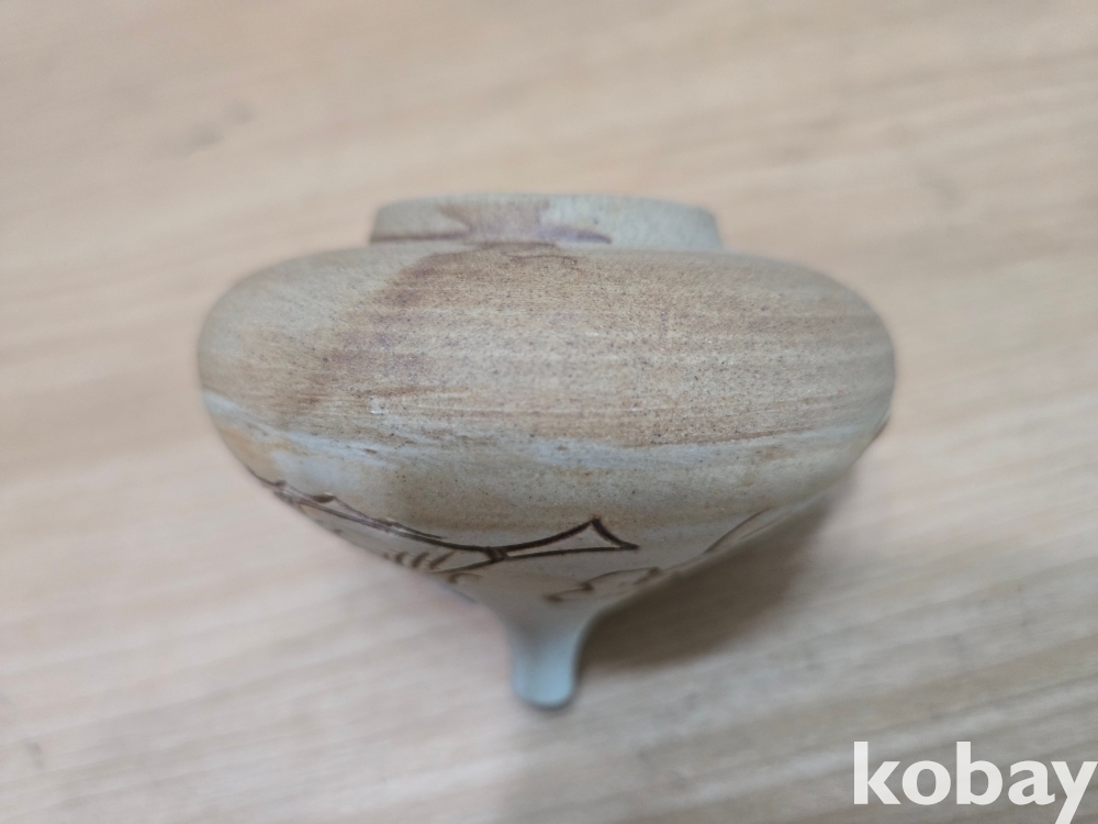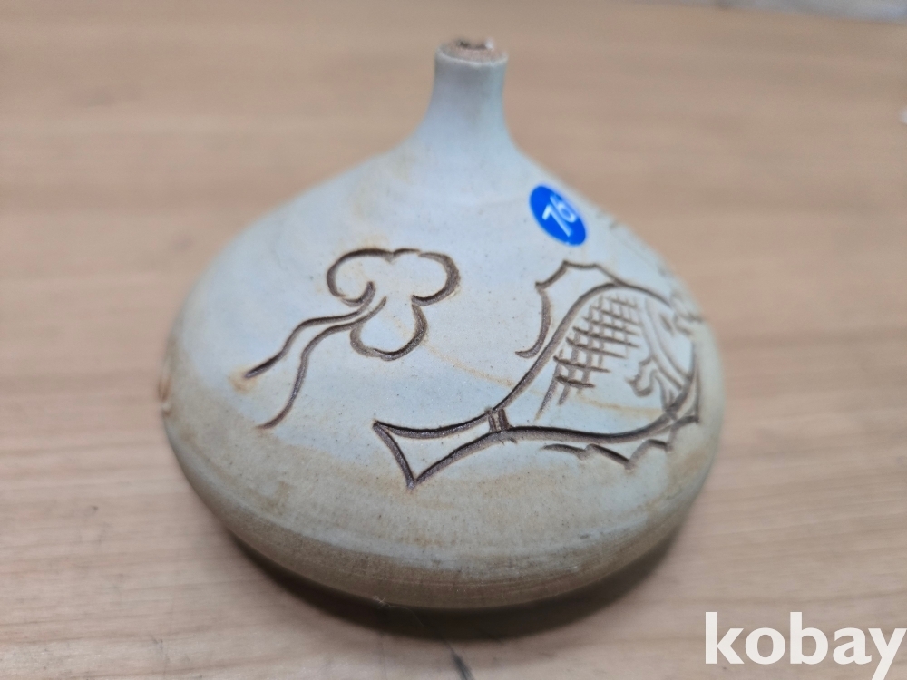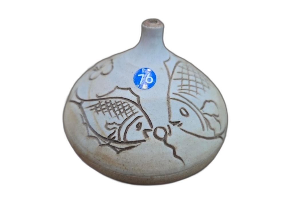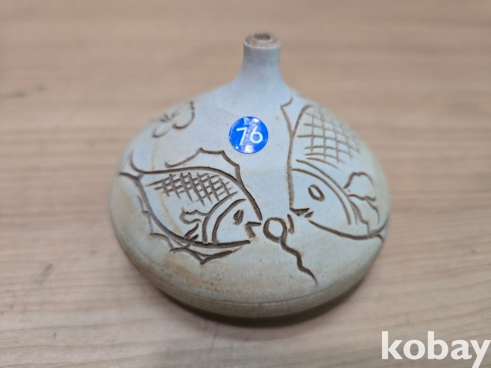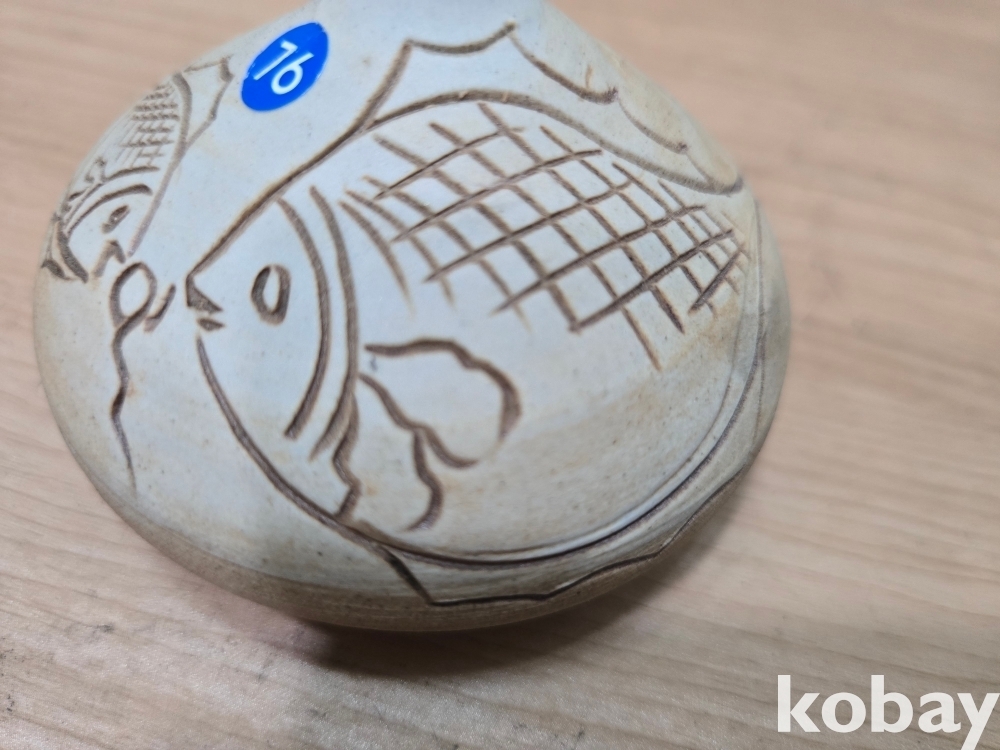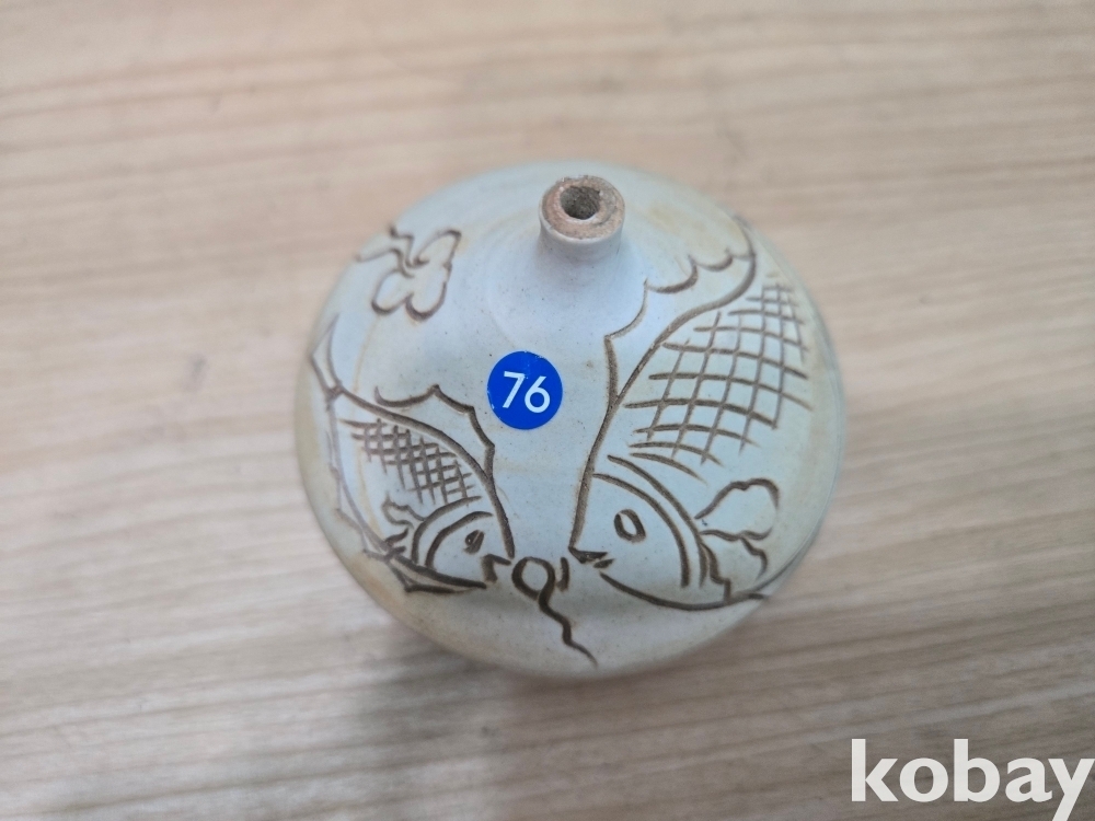 물고기 문양이 음각으로 표현된 입이 작은 도자기 입니다.