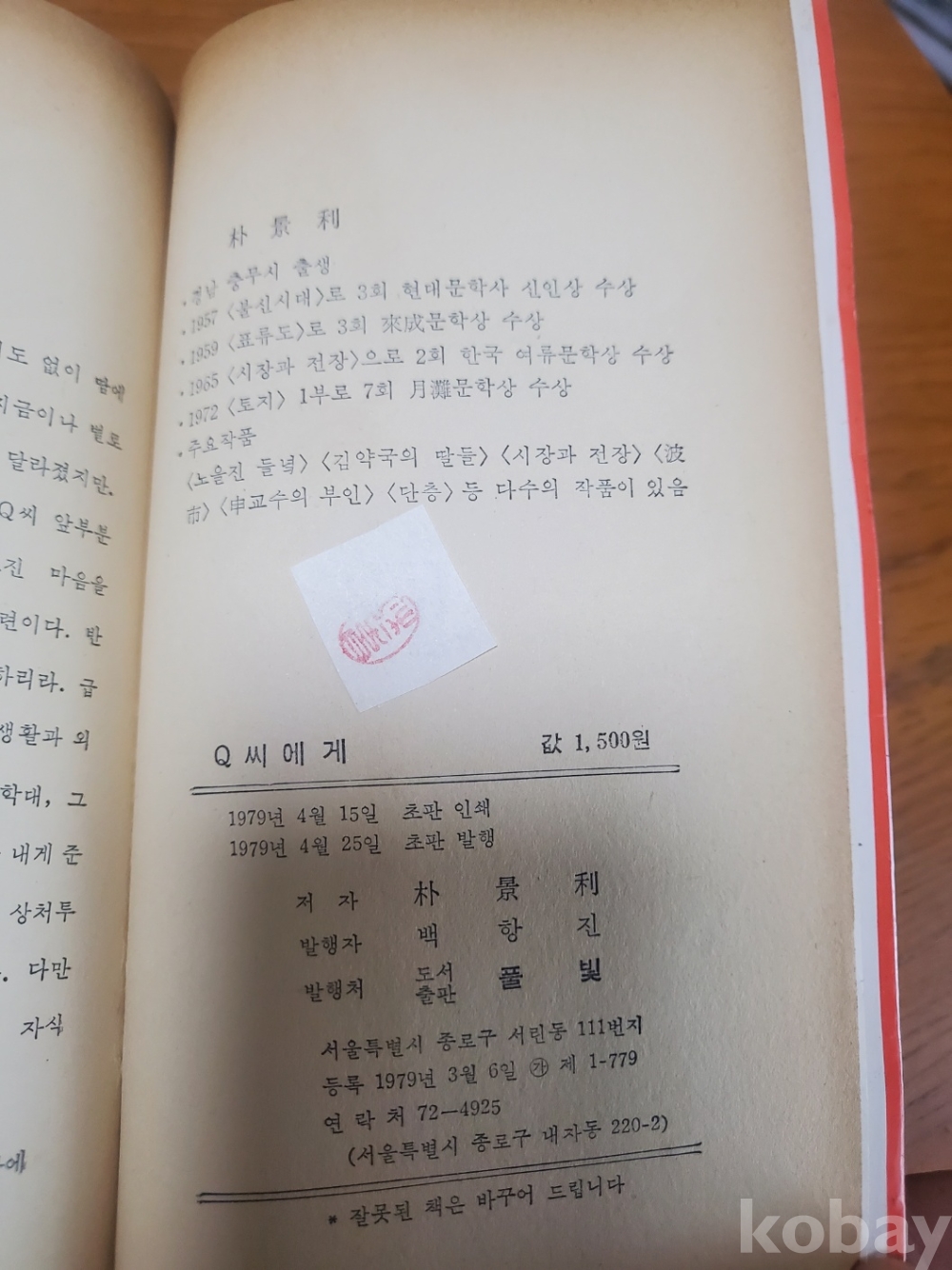 1. Q씨에게, 박경리, 도서출판 풀빛, 1979년, 228쪽, 상태 상, 사진 참조