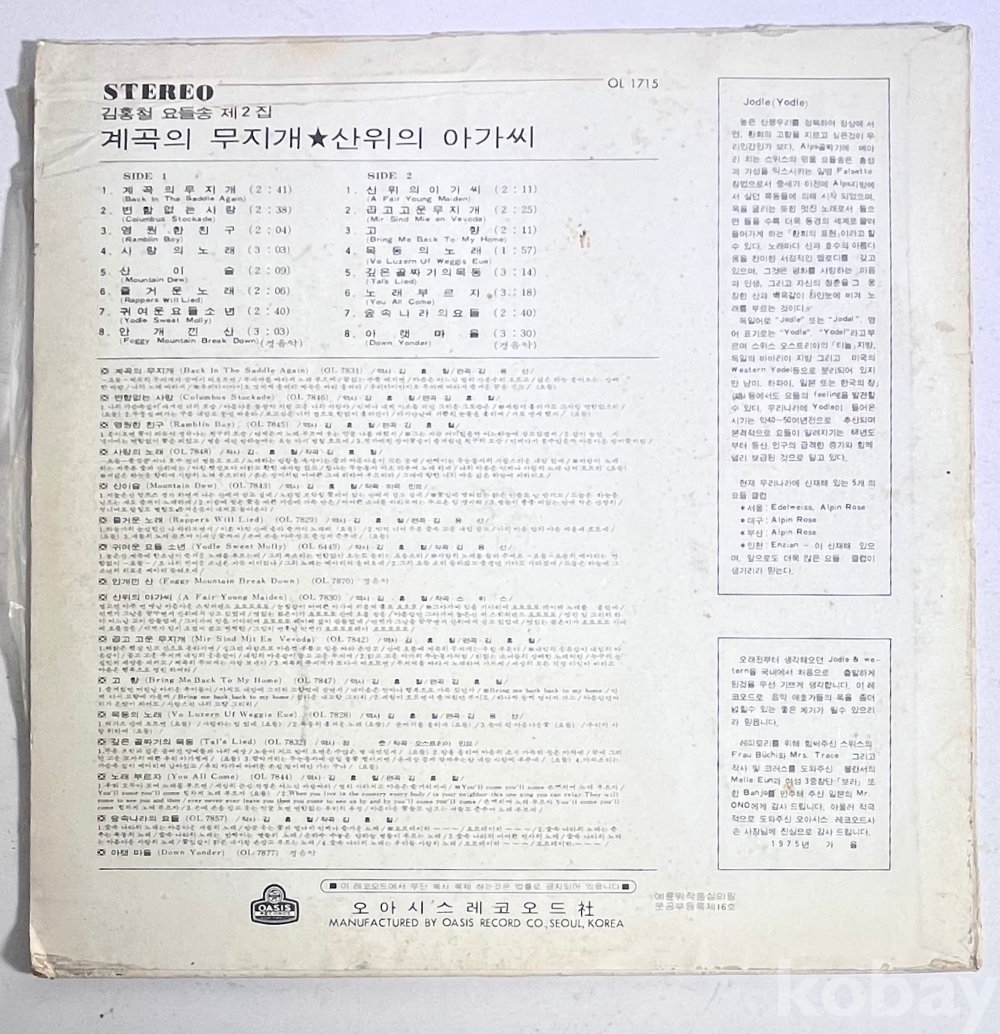김홍철 요들송 제2집 계곡의 무지개/산위의 아가씨 LP판입니다.