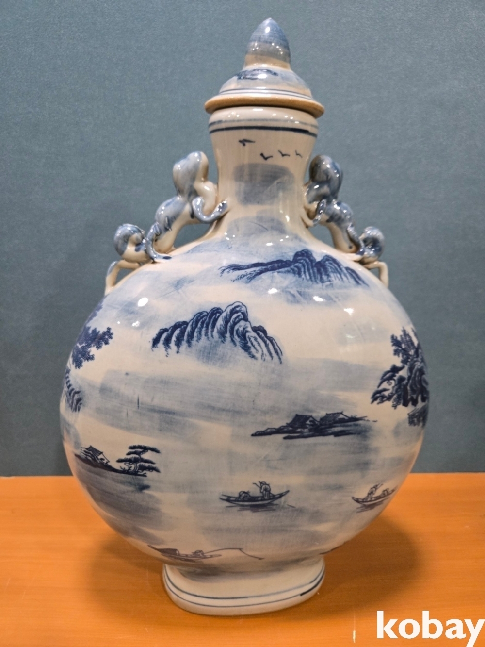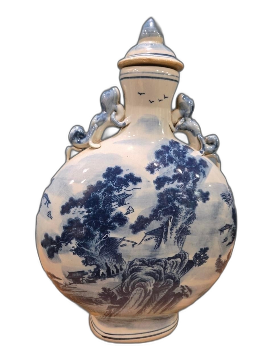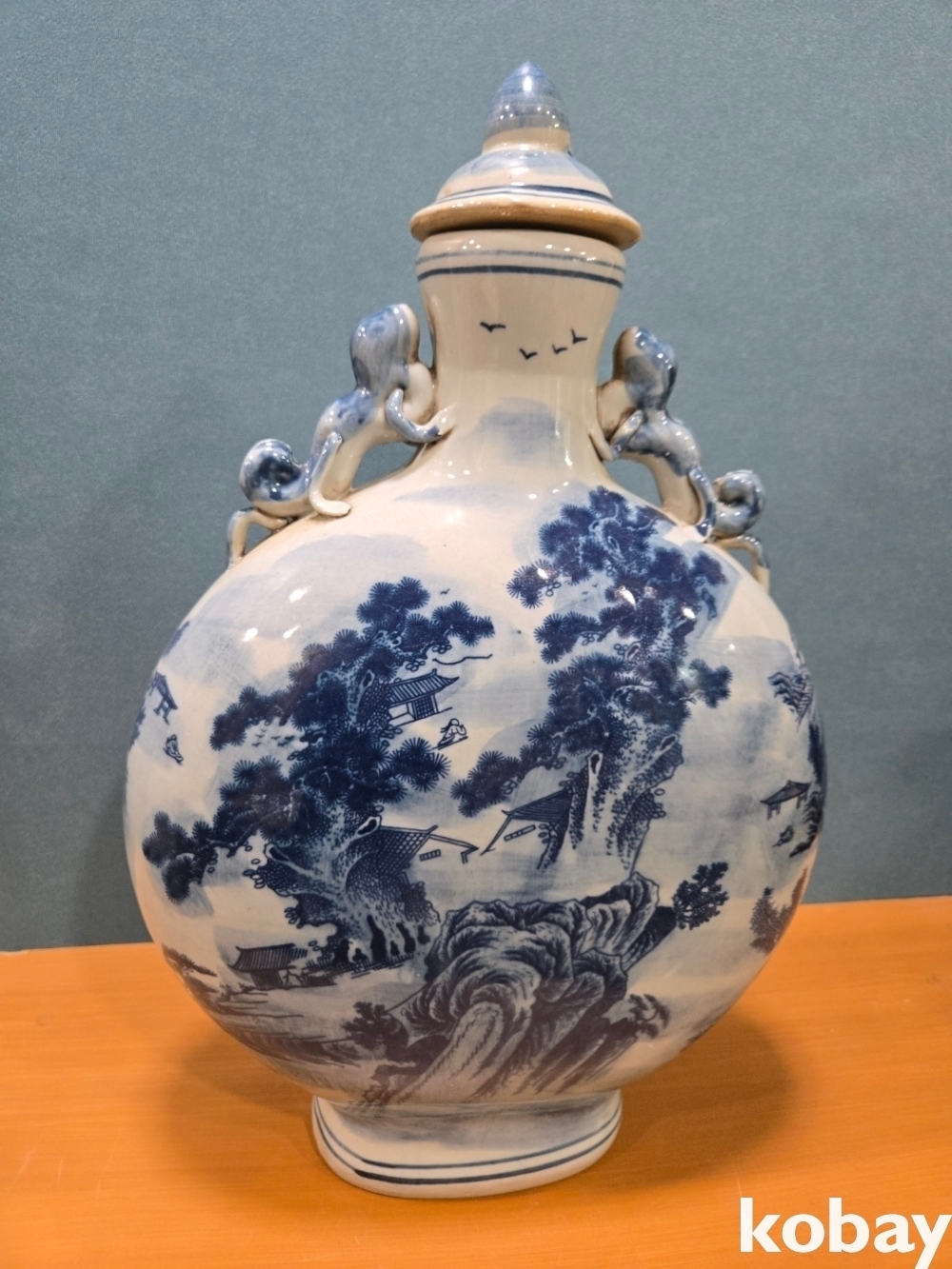 산수 풍경이 양면에 표현된 둥근 편병 도자기 입니다.