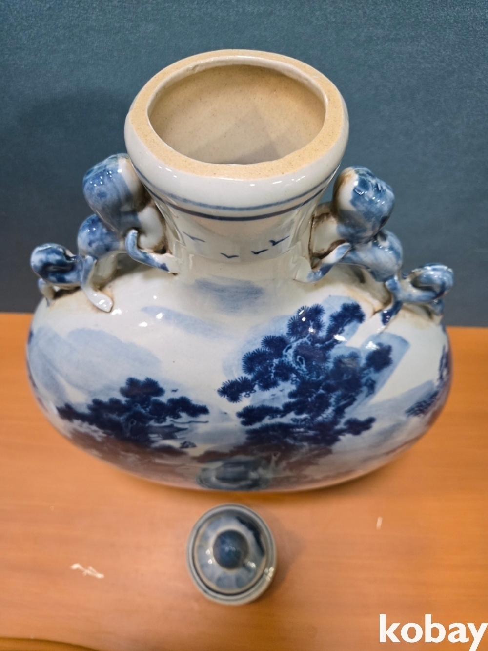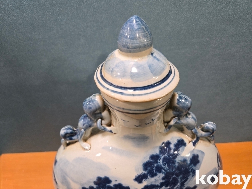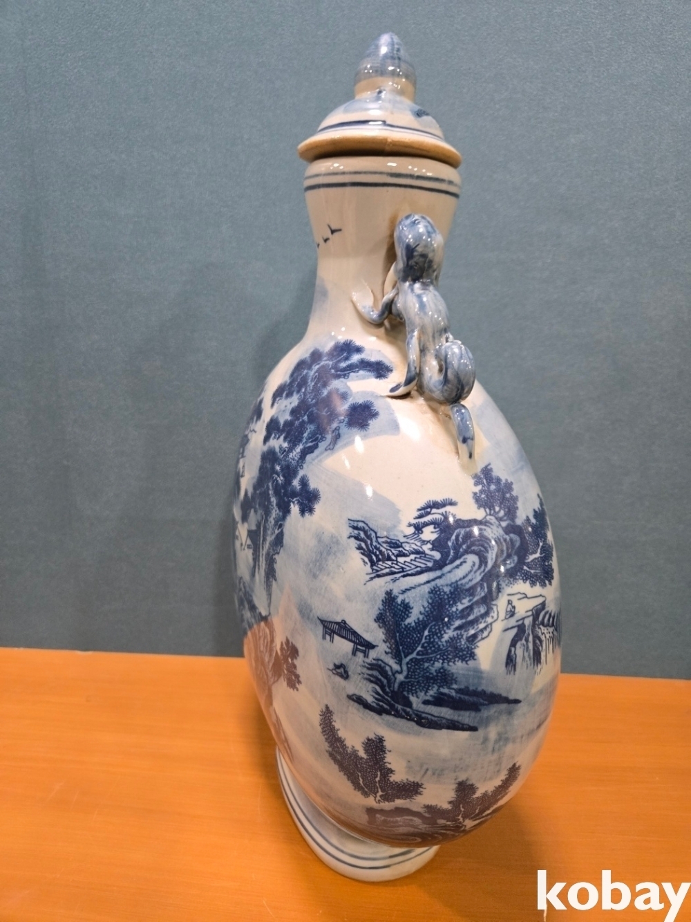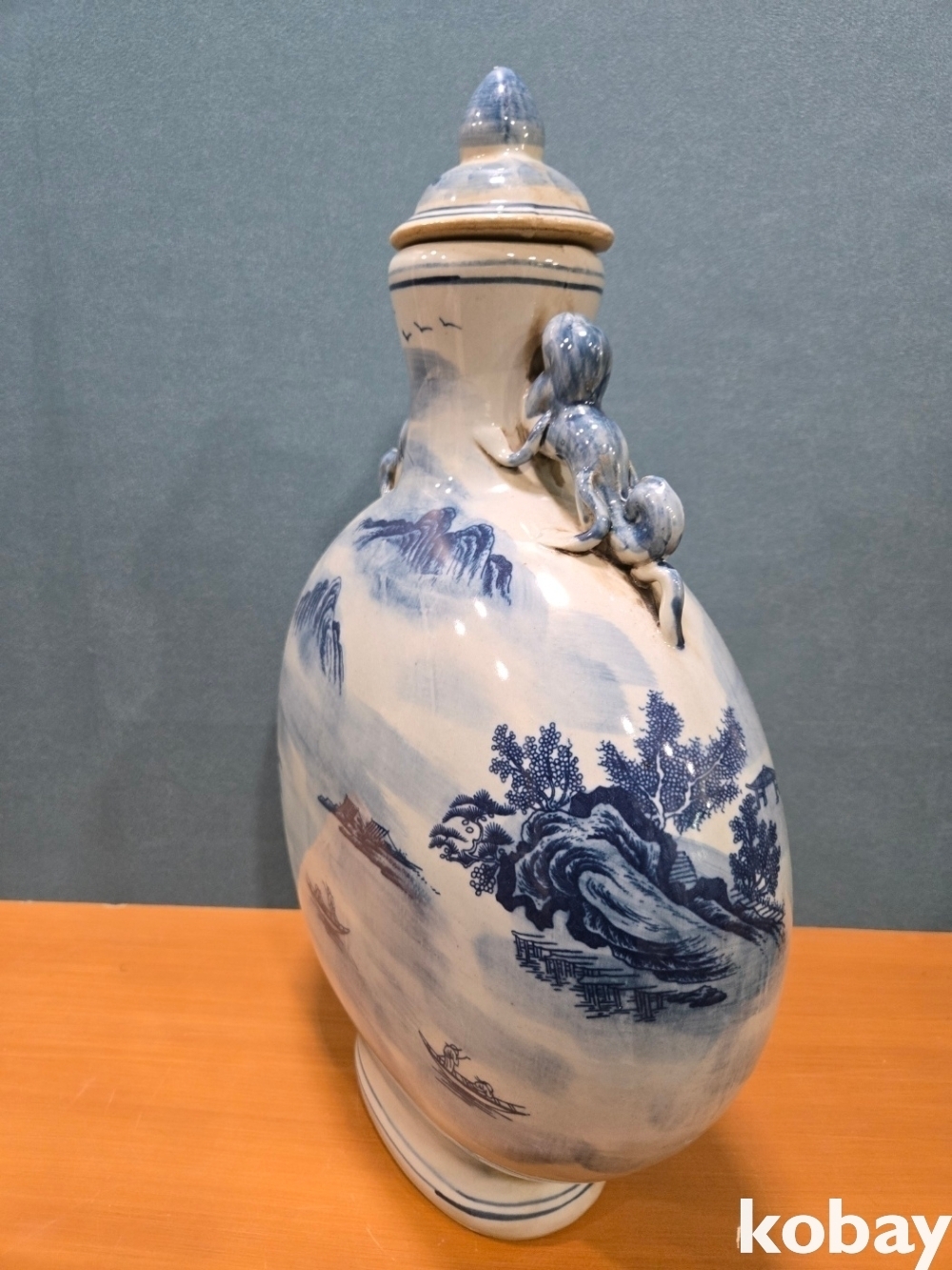 산수 풍경이 양면에 표현된 둥근 편병 도자기 입니다.