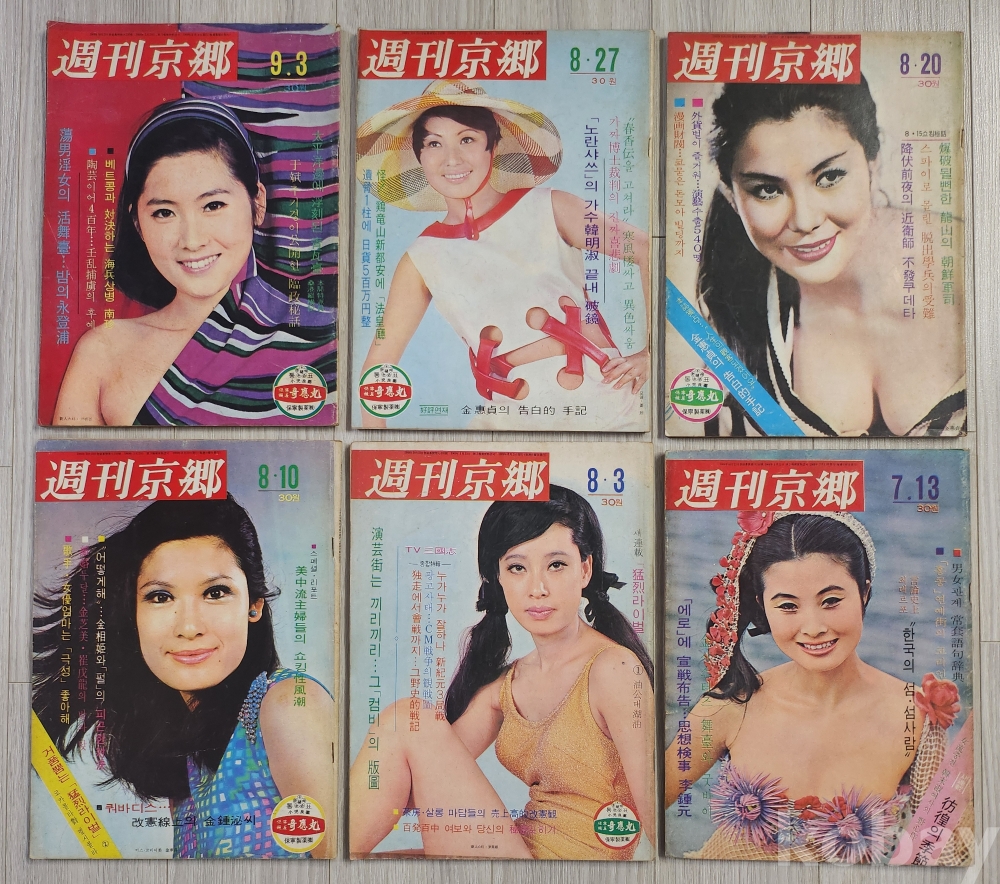 1969년 주간경향 (정가30원) 6권 입니다 주간경향이 1968년11월에 창간되었으니(69년도 7월1권.8월4권.9월1권 합 6권) 창간1년도 안된책 입니다 57년전 책입니다 당대광고. 이슈거리.연예인사진등이 실려 있습니다 오랜세월에도 낙질파본없고 새책같은상태 입니다