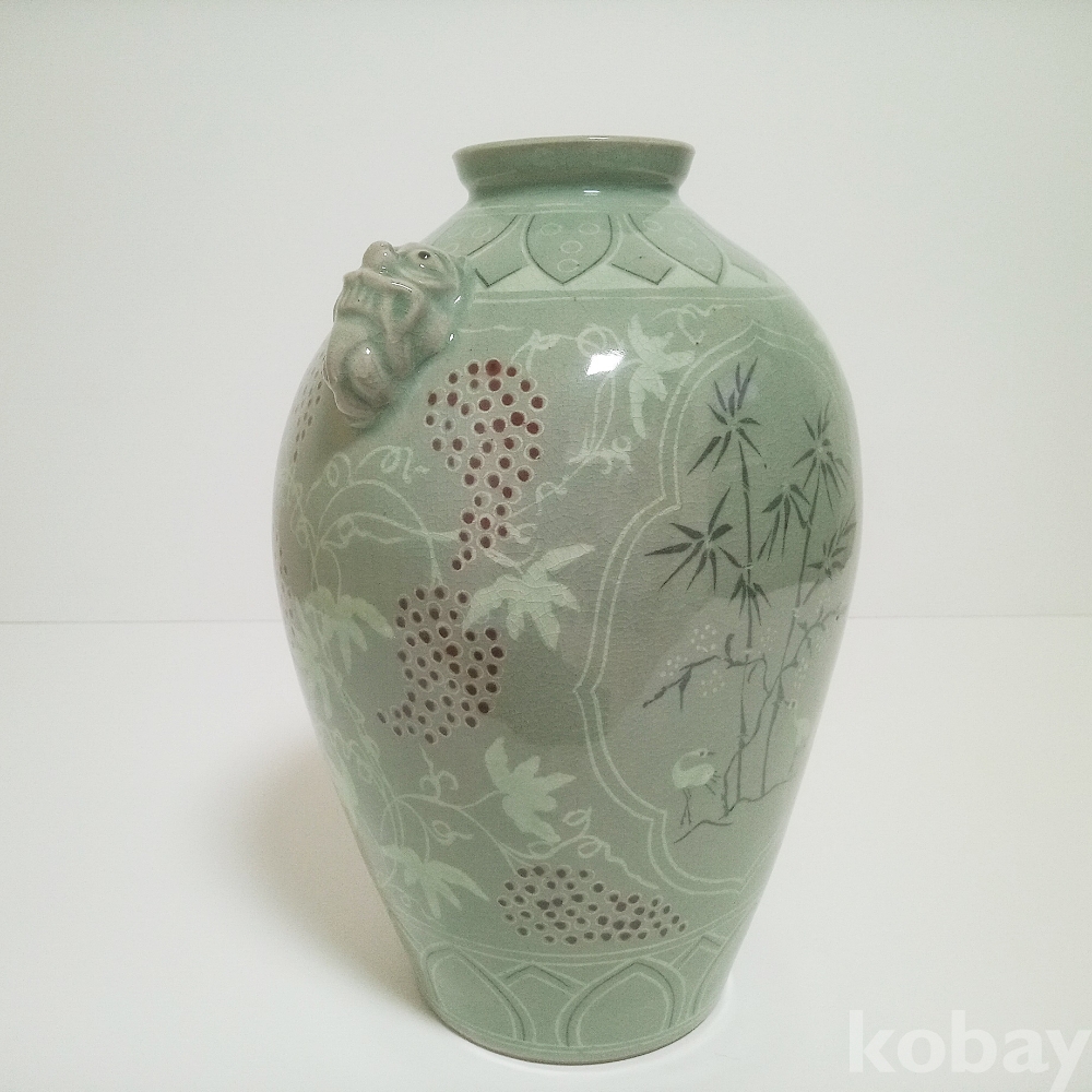 청자 빛깔좋으며 ,윗쪽 연판문과 오리 대나무 포도 넝쿨