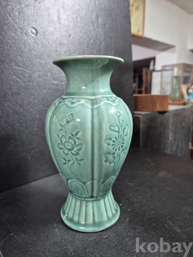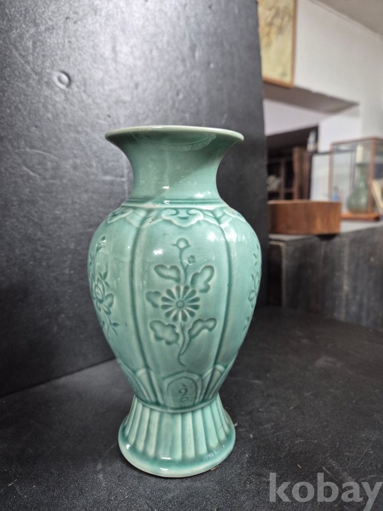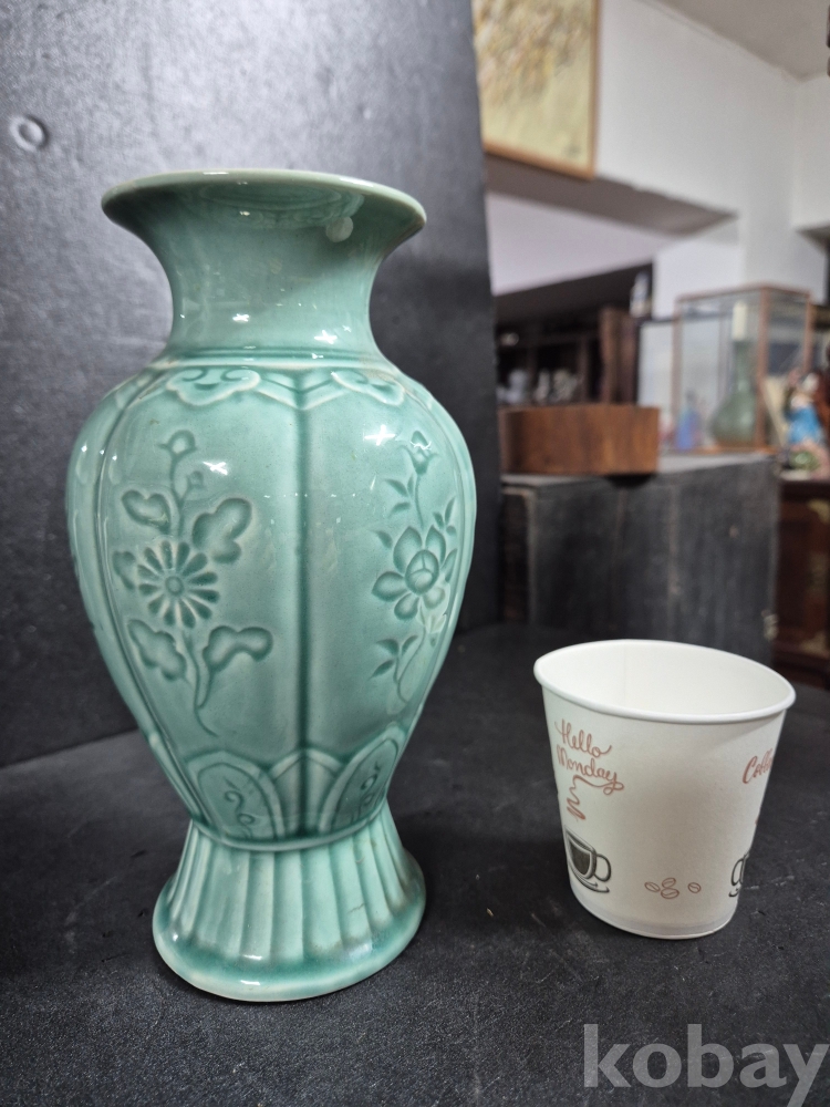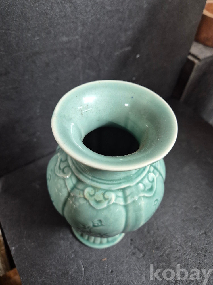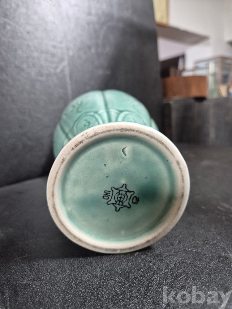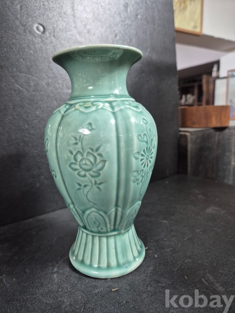 사이즈는 높이 20.5cm이고 구연부 8.5 cm인 녹유 유약바탕에 꽃을 음각으로 새긴 동아화병이며 알튐, 유 없이 온전합니다.
