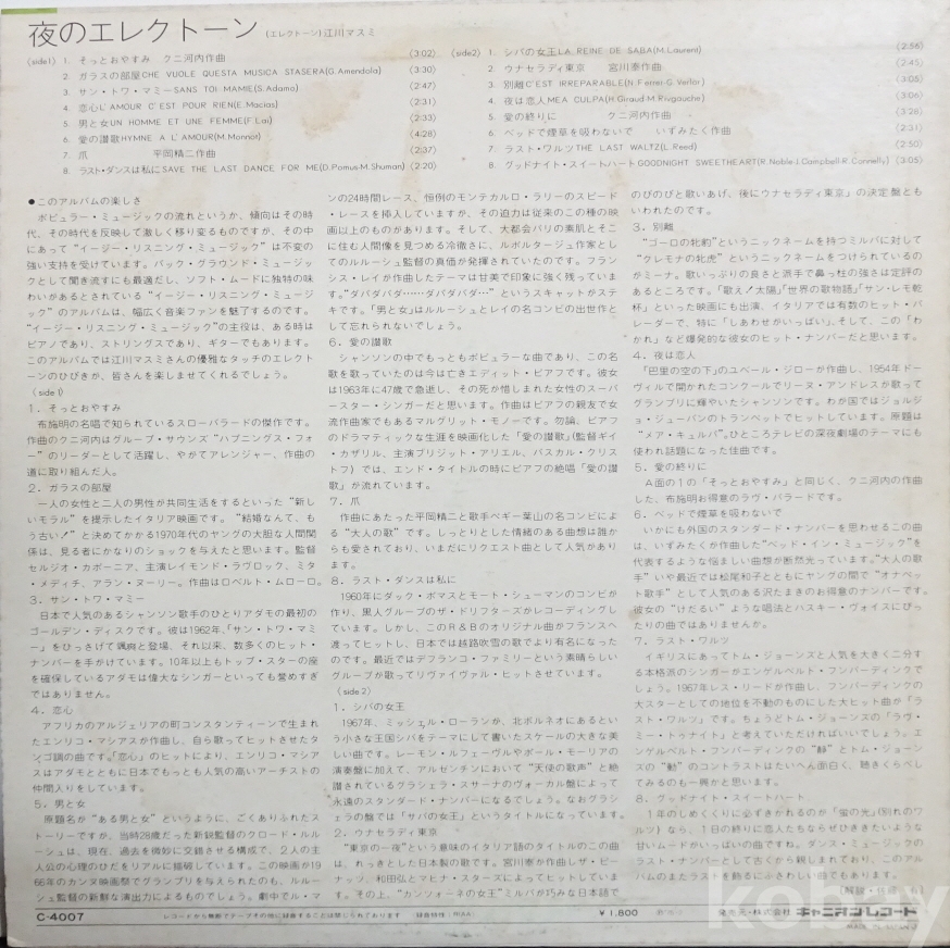 | 자켓상태 | VG : 주름, 접힘, 모서리 찢김 다수 | 음반상태 | NM : 개봉했으나 미사용급, 스크래치 없음 | 발매정보 | 알수없음 | 가사지여부 | 무 |