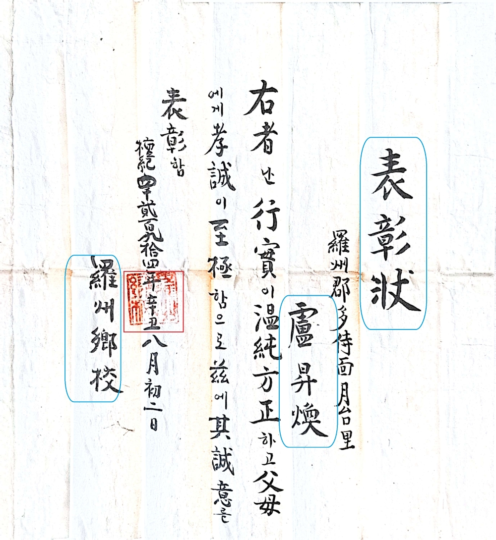 행실이 온순방정하고 부모에게 효성이 지극함으로 내린 표창장.