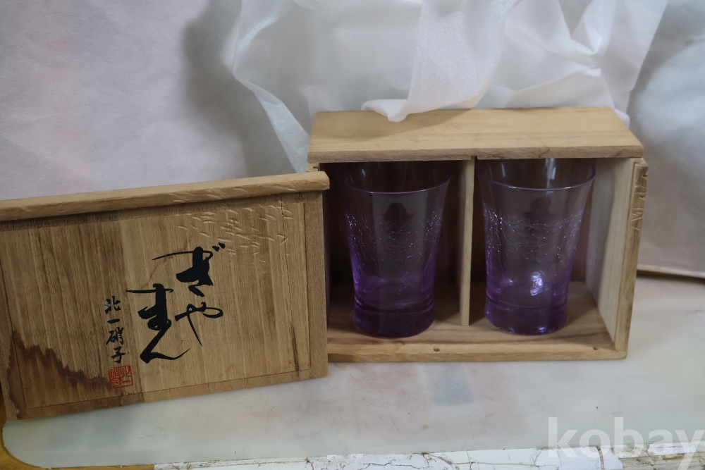 일본 유럽 유리 공예 시조 키타 이치 임니다 오리지날 상자에 보관해온 키타이치의 명품 부부잔 2 세트 임니다 묘한 색감 디자인 등등 작가의 혼을 가진 명물 임니다 상자는 세월의 흔적이 보임니다