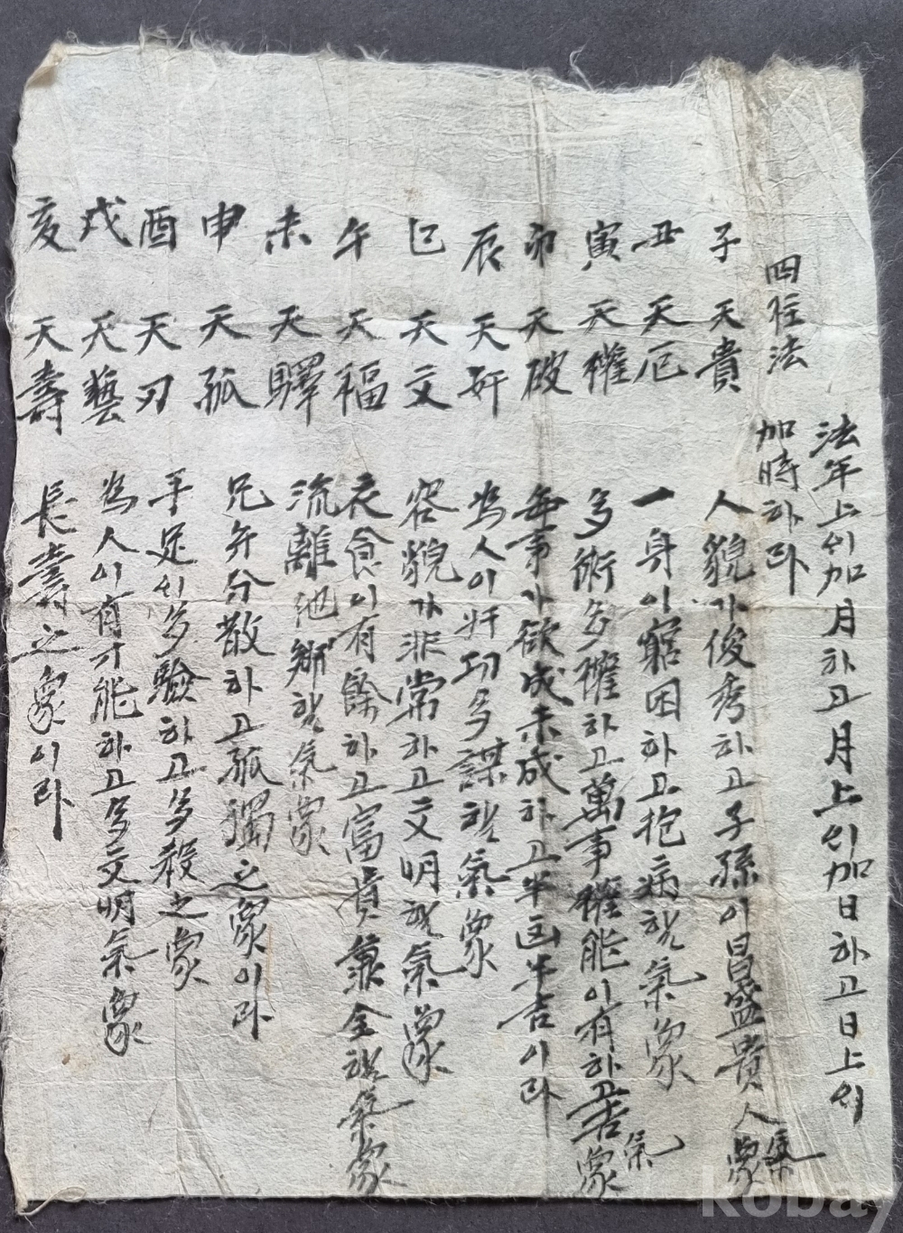유물 성격: 태어난 시를 바탕으로 길흉화복을 점치는 '당사주' 방식의 운세 감정서입니다.