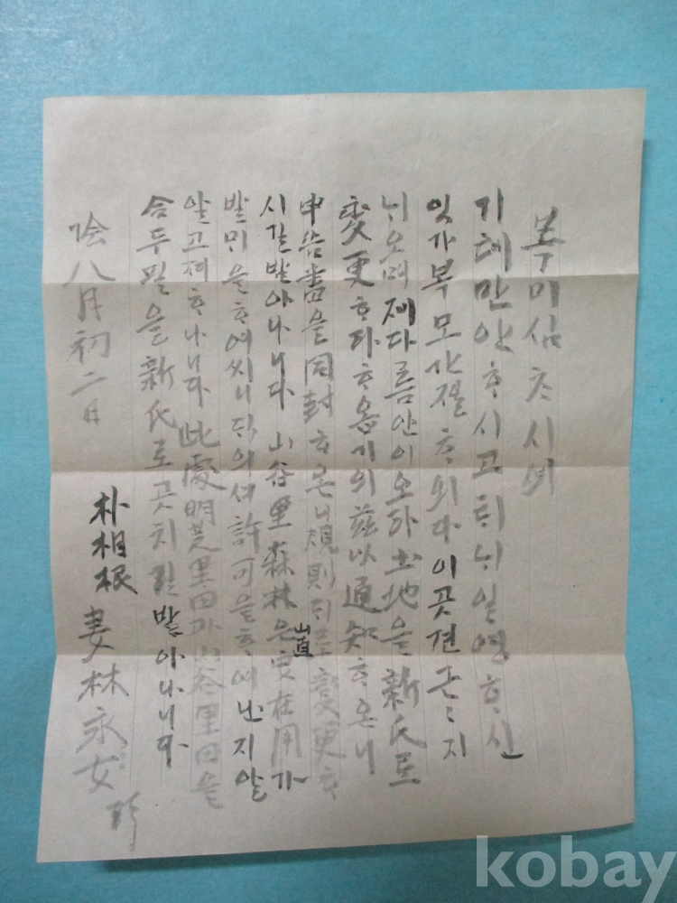 소화 16년 1941년 음력 8월2일의 양식지에 쓰인 국,한 혼용의 간찰