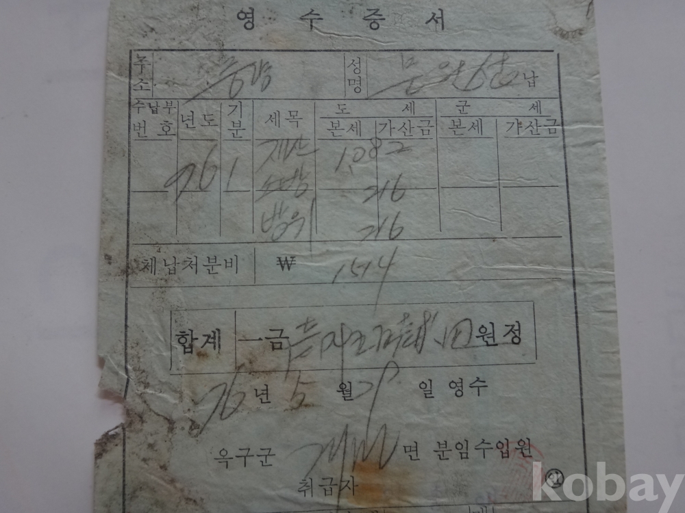 옥구군 재산세 - 영수증 (..취급자의 기명 날인이 없는 것은 무효임, 1976년)