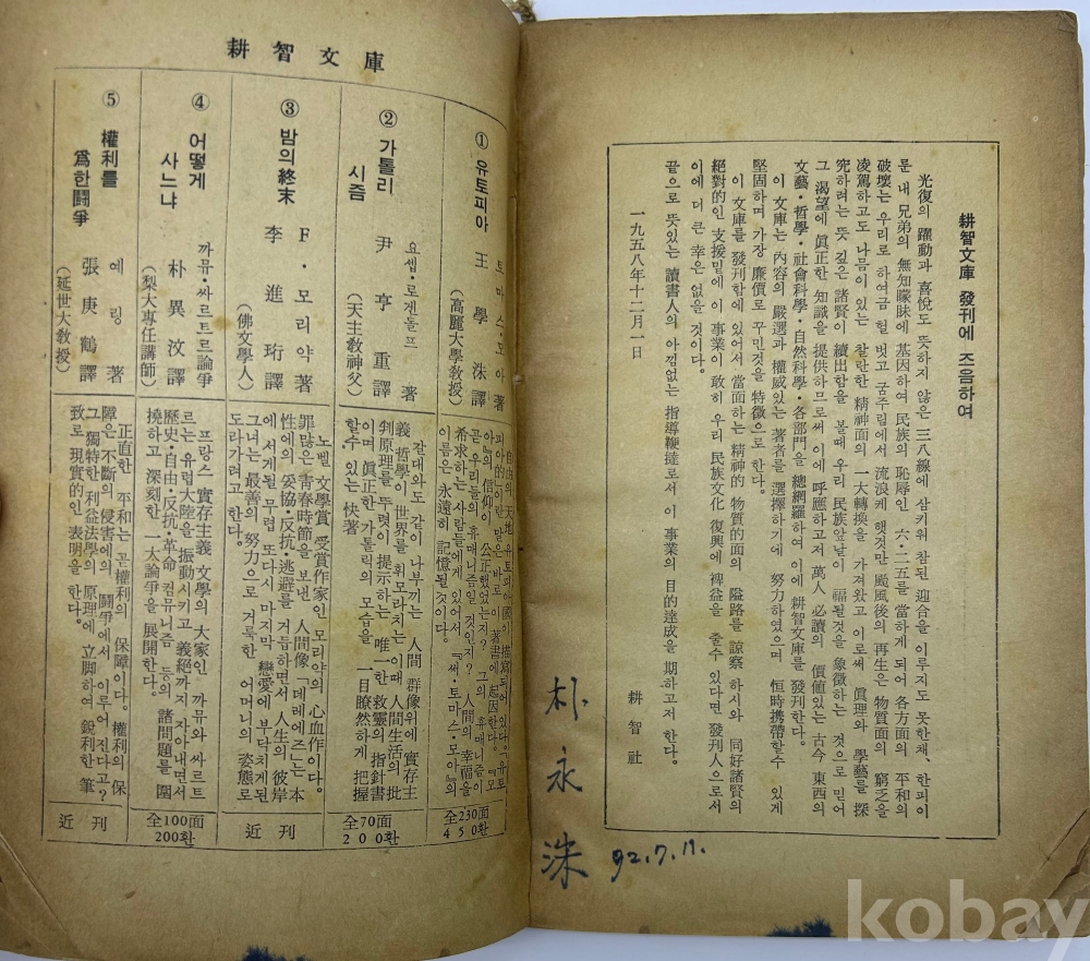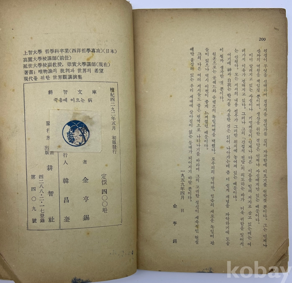 물 품 명 | <좋-았書! 1탄> [3] 1959년 발행, 키르케고르 저 [죽음에 이르는 병] 초판본 1책 | |||||