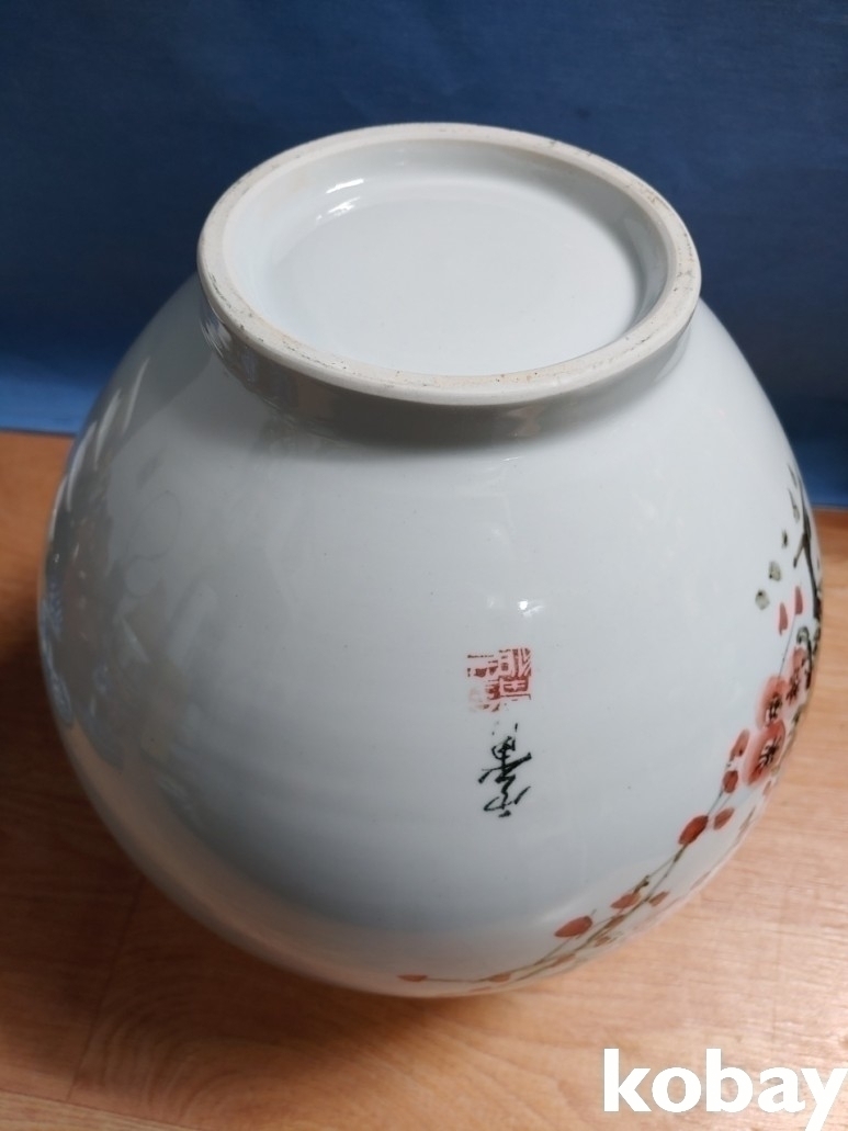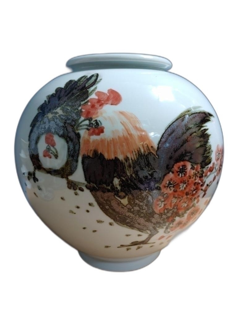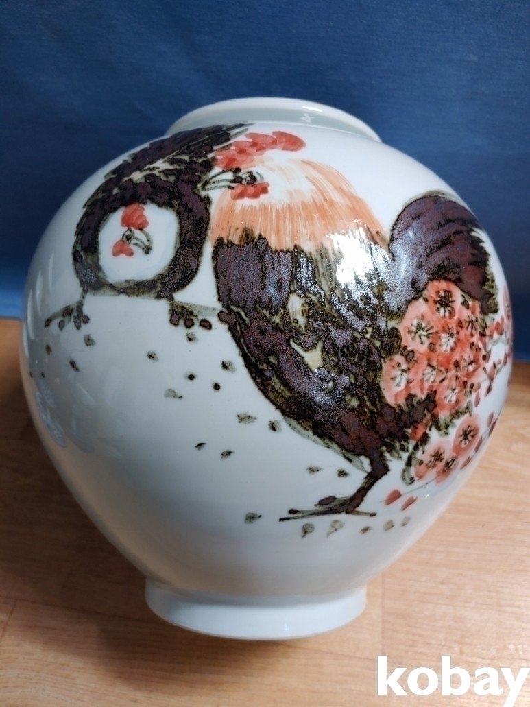 철화로 닭과 매화 꽃을 표현한 도자기 입니다.
