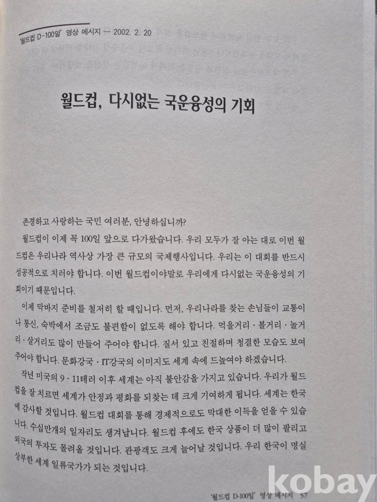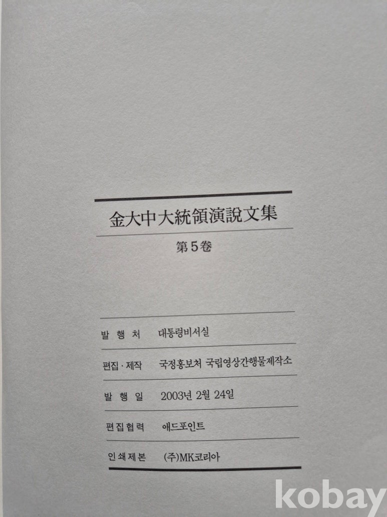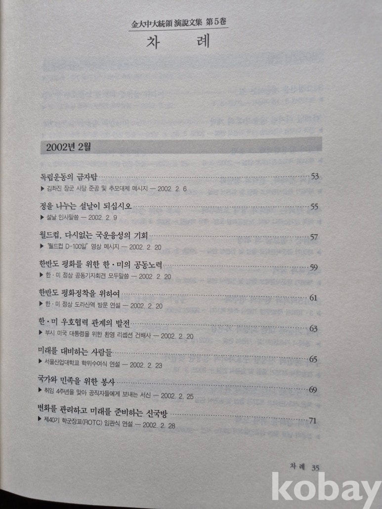 설명: 이 책에는 김대중 대통령 연설문집 제5권 2002년 2월 1일 ~ 2003년 2월 21일 김대중대통령 1년간 연설문 모음 자료집 입니다.
