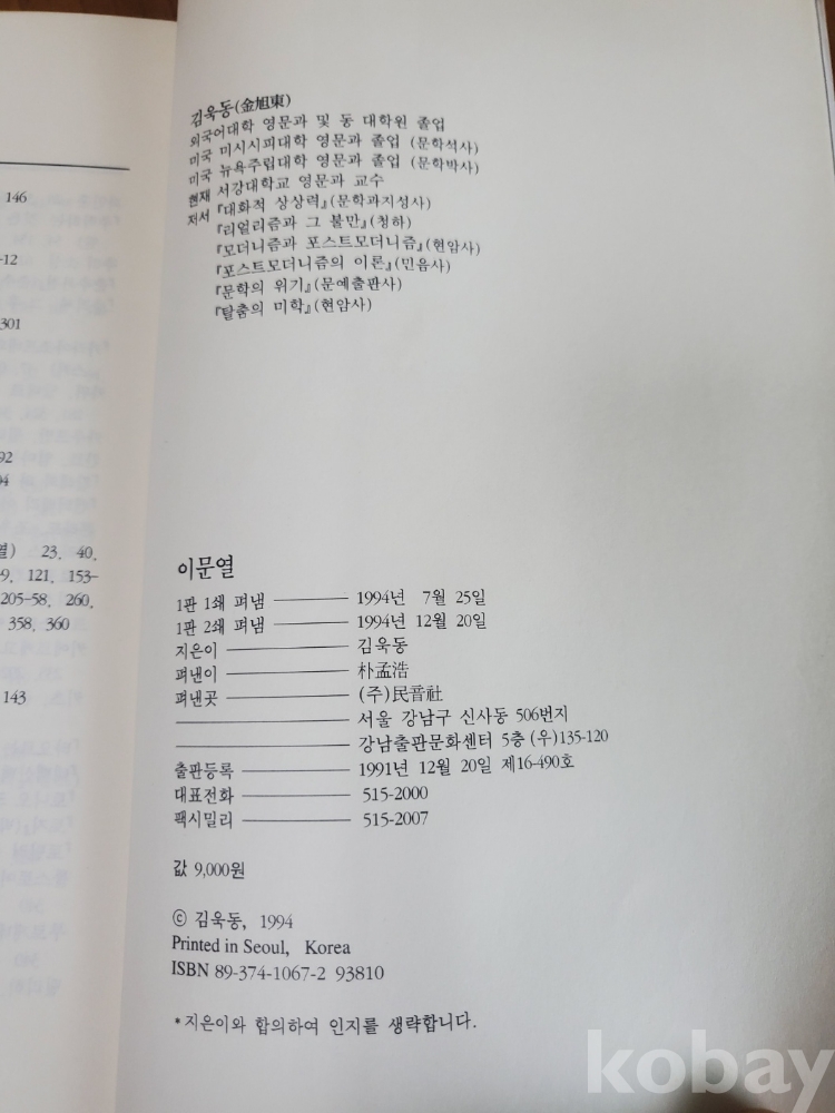 1. 이문열, 김욱동, 민음사, 1994년, 434쪽, 상태 상, 사진 참조
