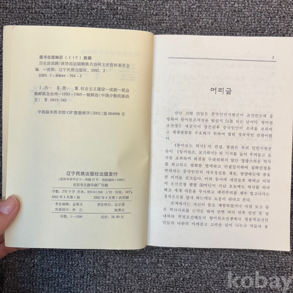 [한국현대사, 6.25전쟁, 항미원조, 중공군 개입] 정협 연변조선족자치주 문사자료위원회 편, <돌아보는 력사>, 료녕민족출판사, 2002, p. 459, 상태 중급(사진참조)
