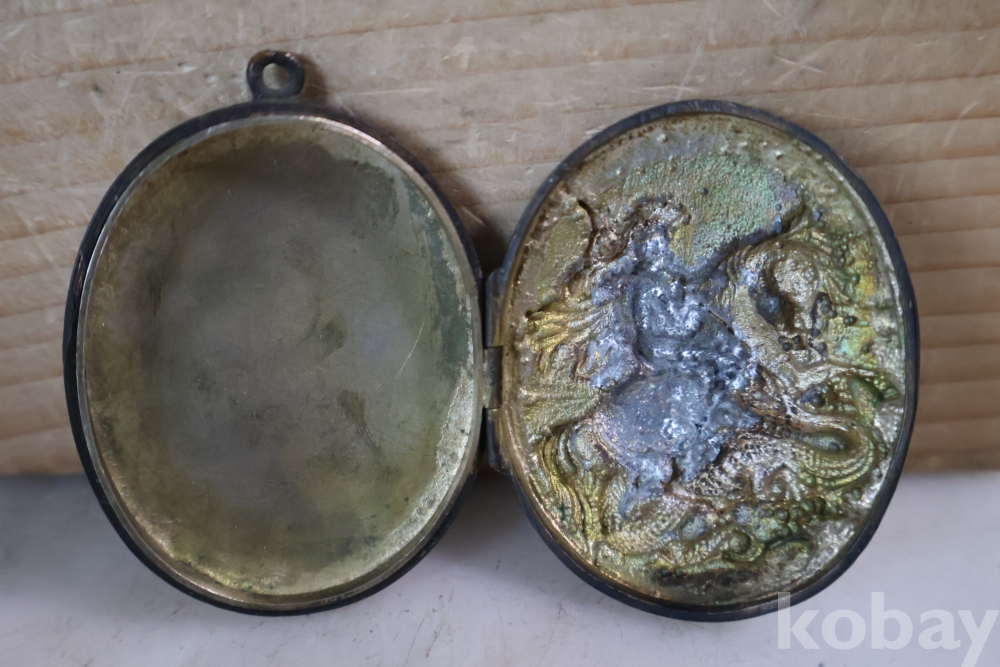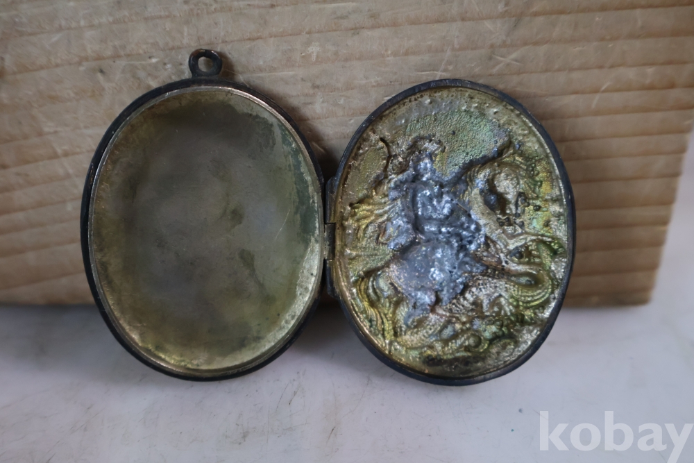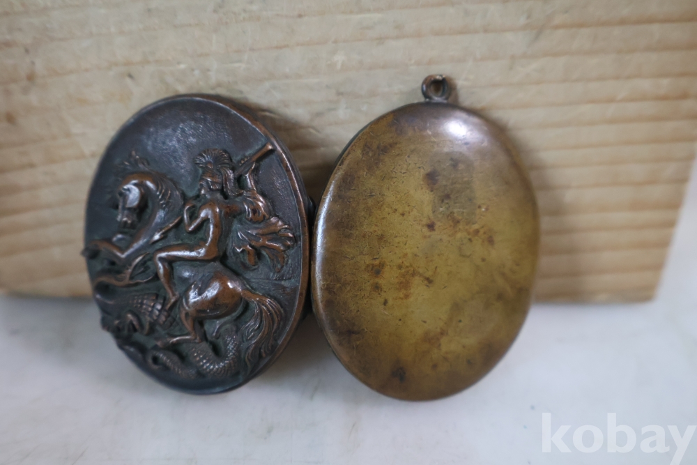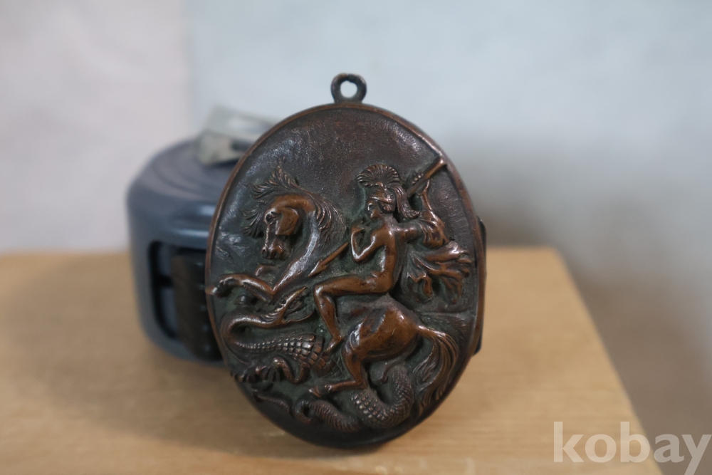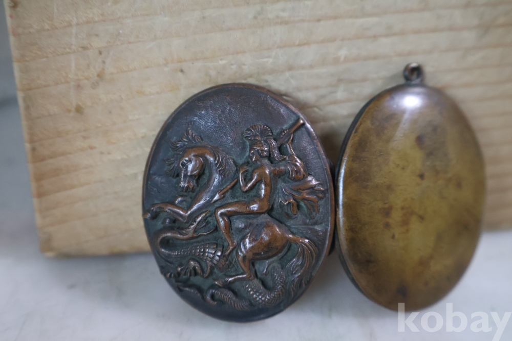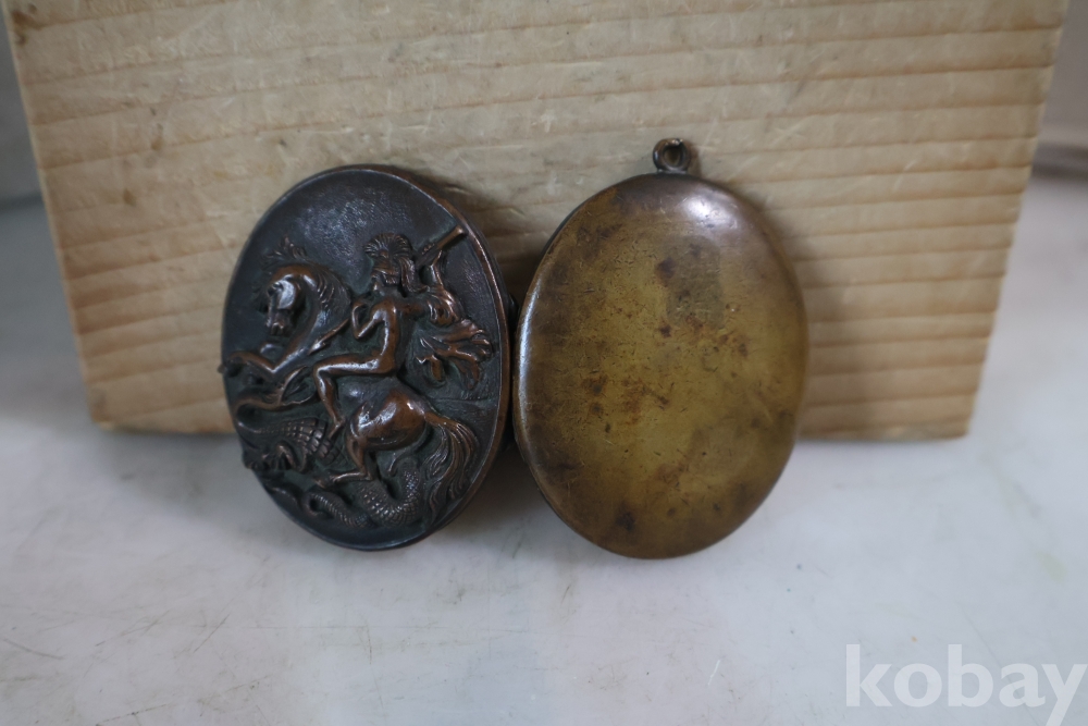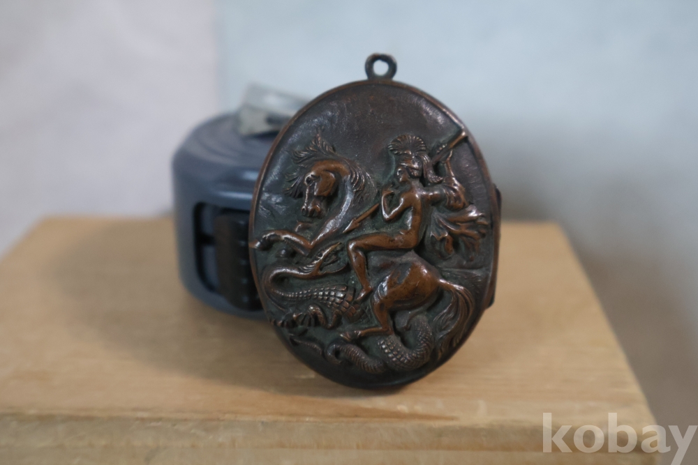 오래된 펜던트 임니다 특히 용과 싸우는 말탄 기사의 부조 를 가진 금속 펜던트 이며 고태미를 가진 오래된 공에품 임니다 .유럽 고미술로 보여 짐니다 자세 한건 사진 참조 하세요 프랑스 로 알고 있읍니다 19세기 고미술 명품