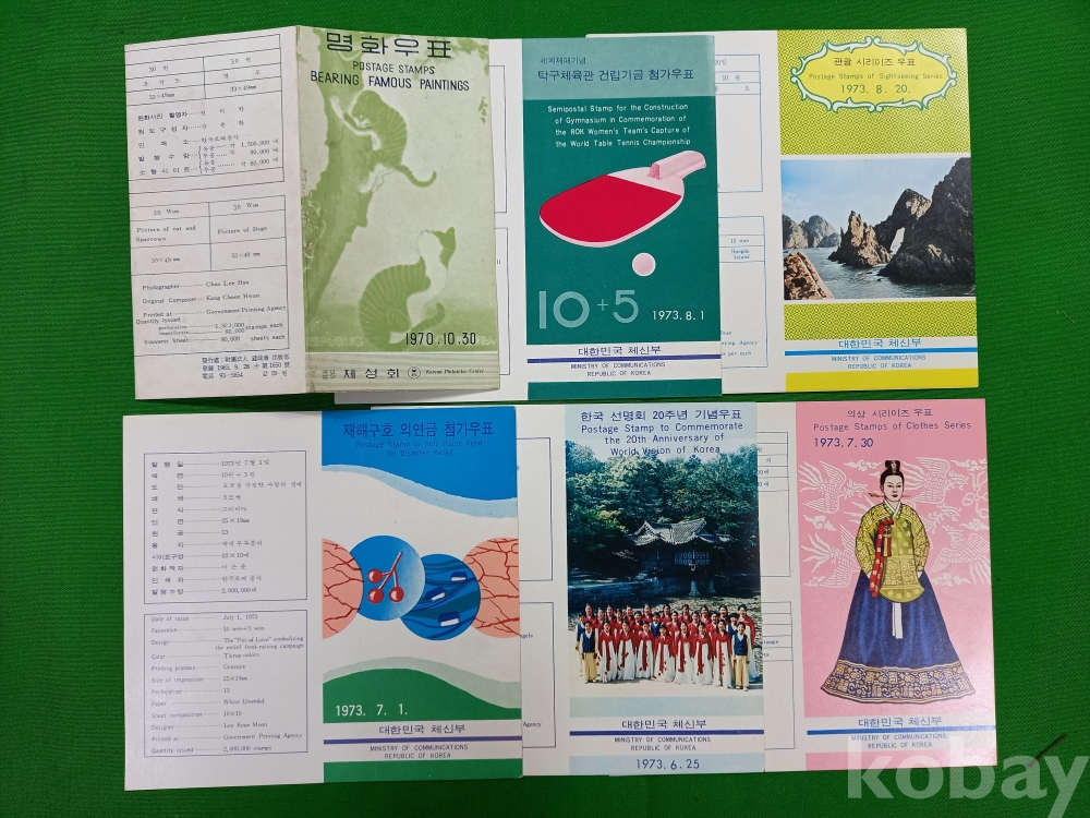 1970년대 초반 대한민국 체신부(현 우정사업본부)에서 발행한 기념우표 안내카드들입니다. 우표 안내카드는 당시 수집가들을 위해 제작되었으며, 근대 우정 역사를 보여주는 자료 입니다.