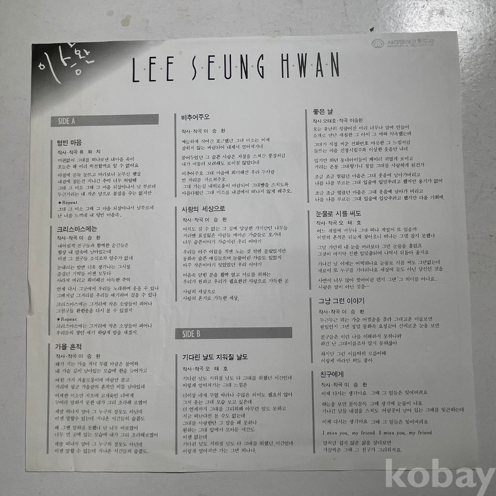 | 자켓상태 | EX : 약간의 마모, 모서리 찢김 존재 | 음반상태 | VG : 생활 기스 다수, 가벼운 노이즈 존재 | 발매정보 | 알수없음 | 가사지여부 | 유 |